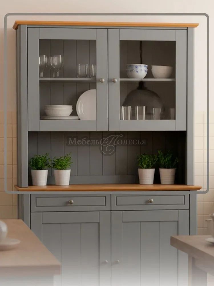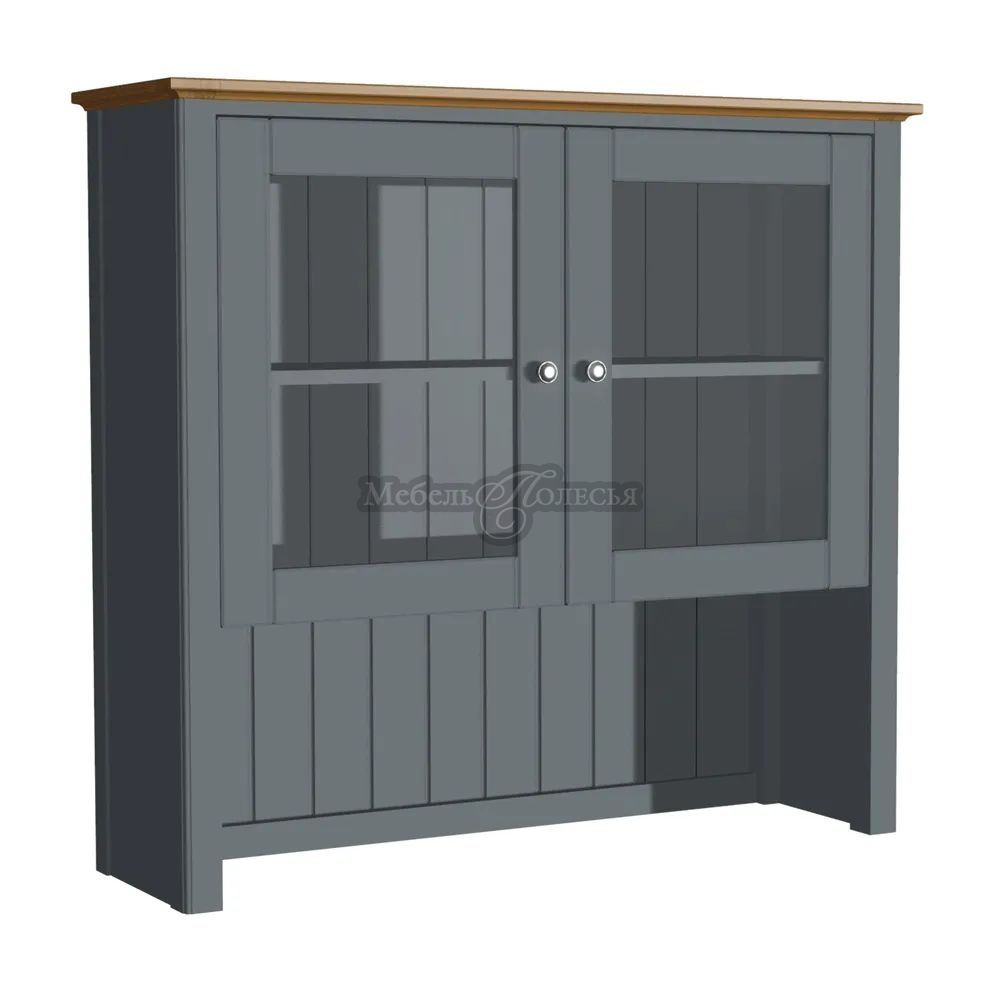 Надстройка имеет отделение для посуды с полкой и двумя остекленными распашными дверцами. Внизу есть пространство, которое при установке на комод образует удобную нишу для кухонных предметов. Фасады и задняя стенка надстройки украшены декоративной фрезеровкой. Дверные петли со встроенными доводчиками закрываются плавно, без хлопков. На дверцах металлические ручки-кнопки с эффектом старения.