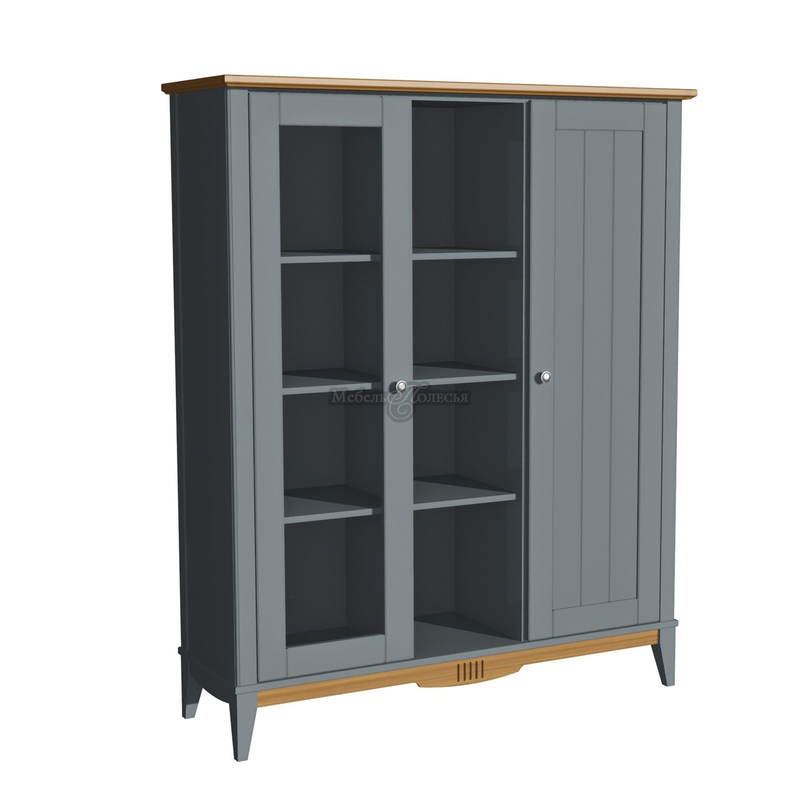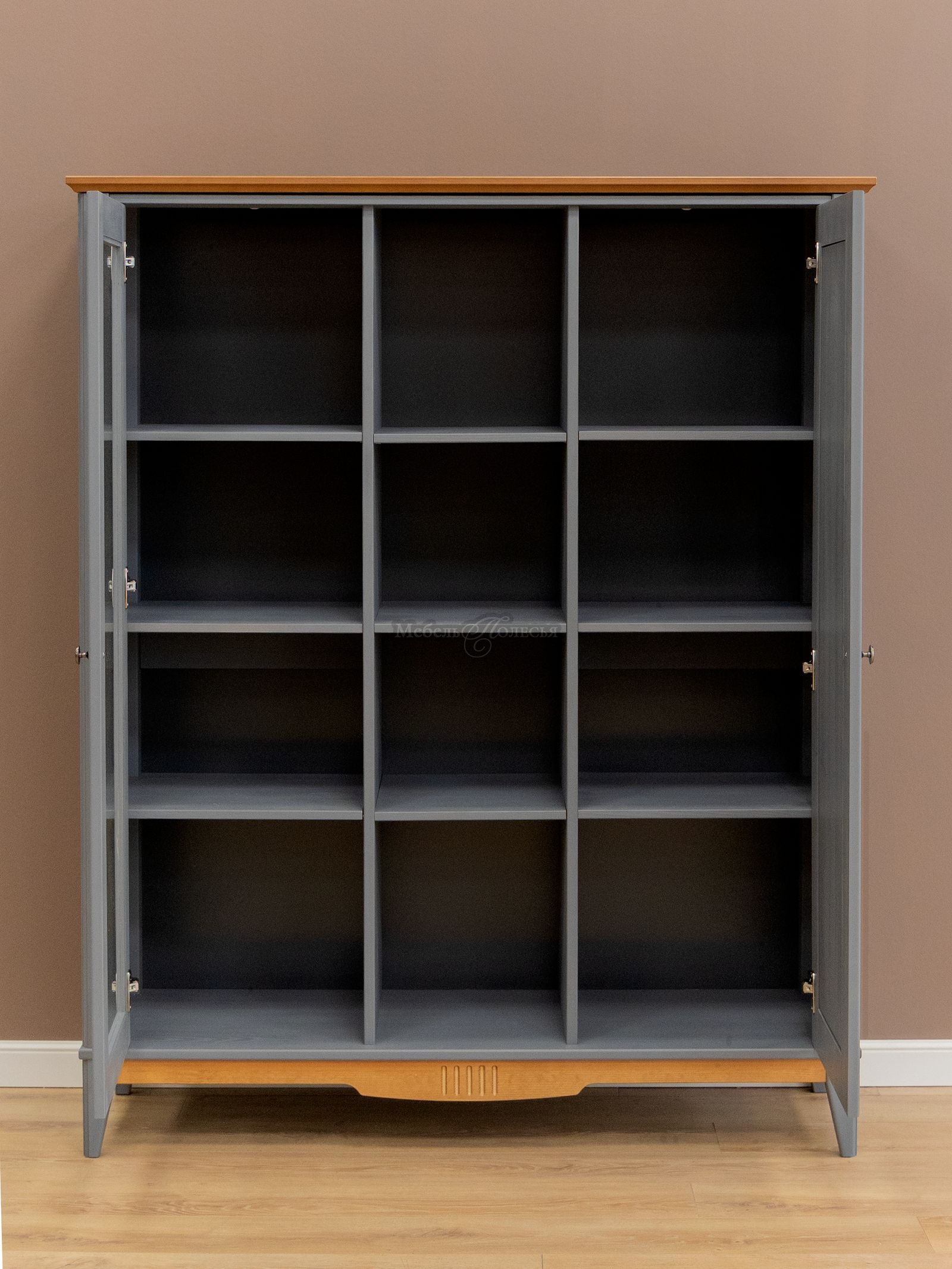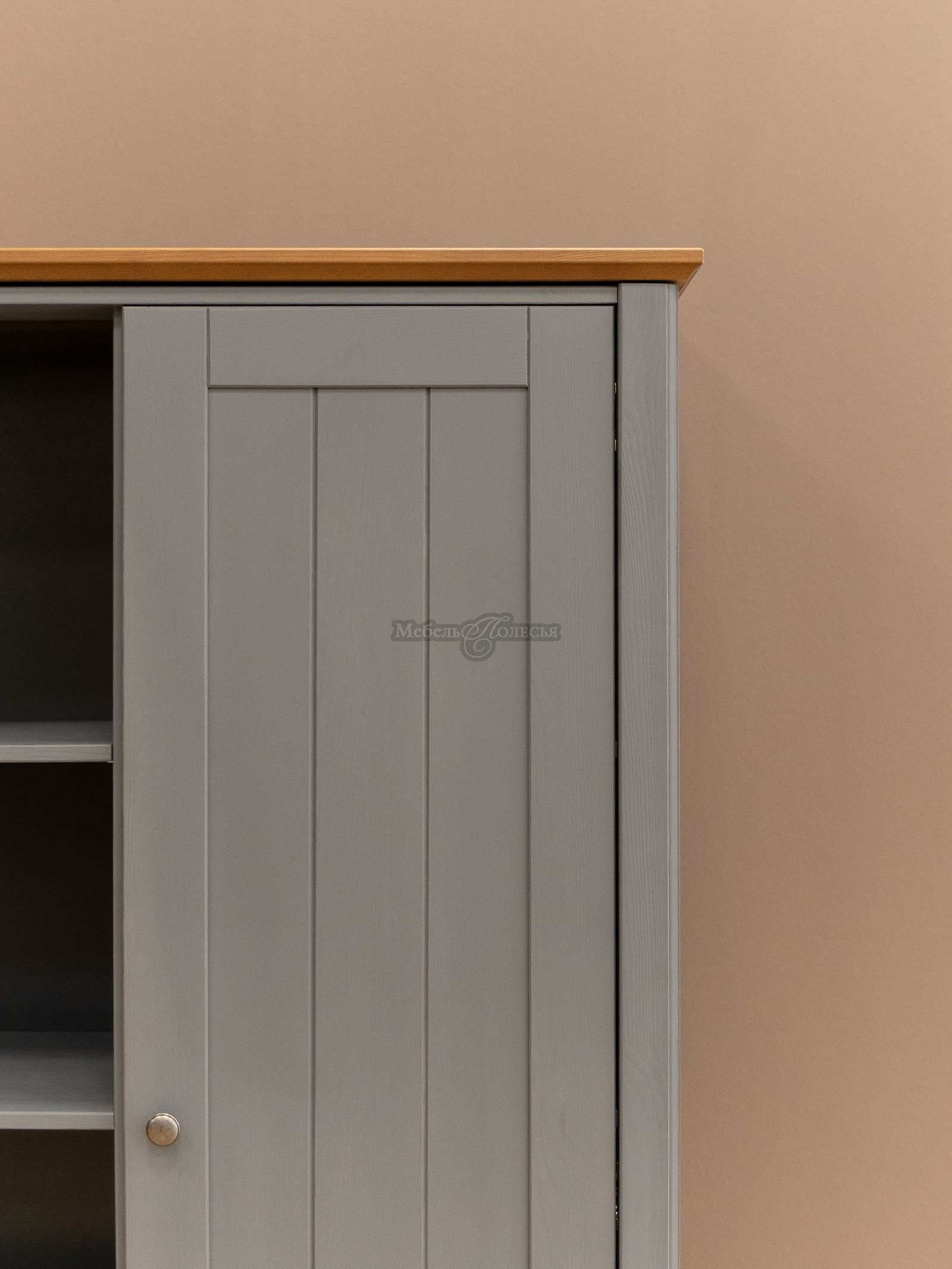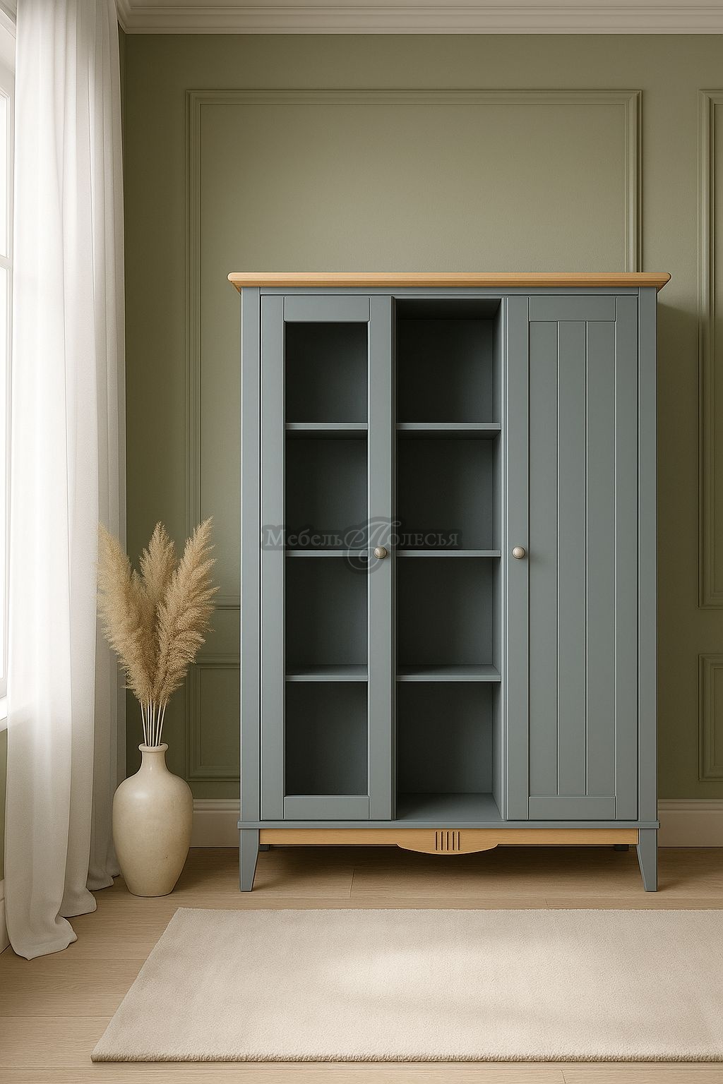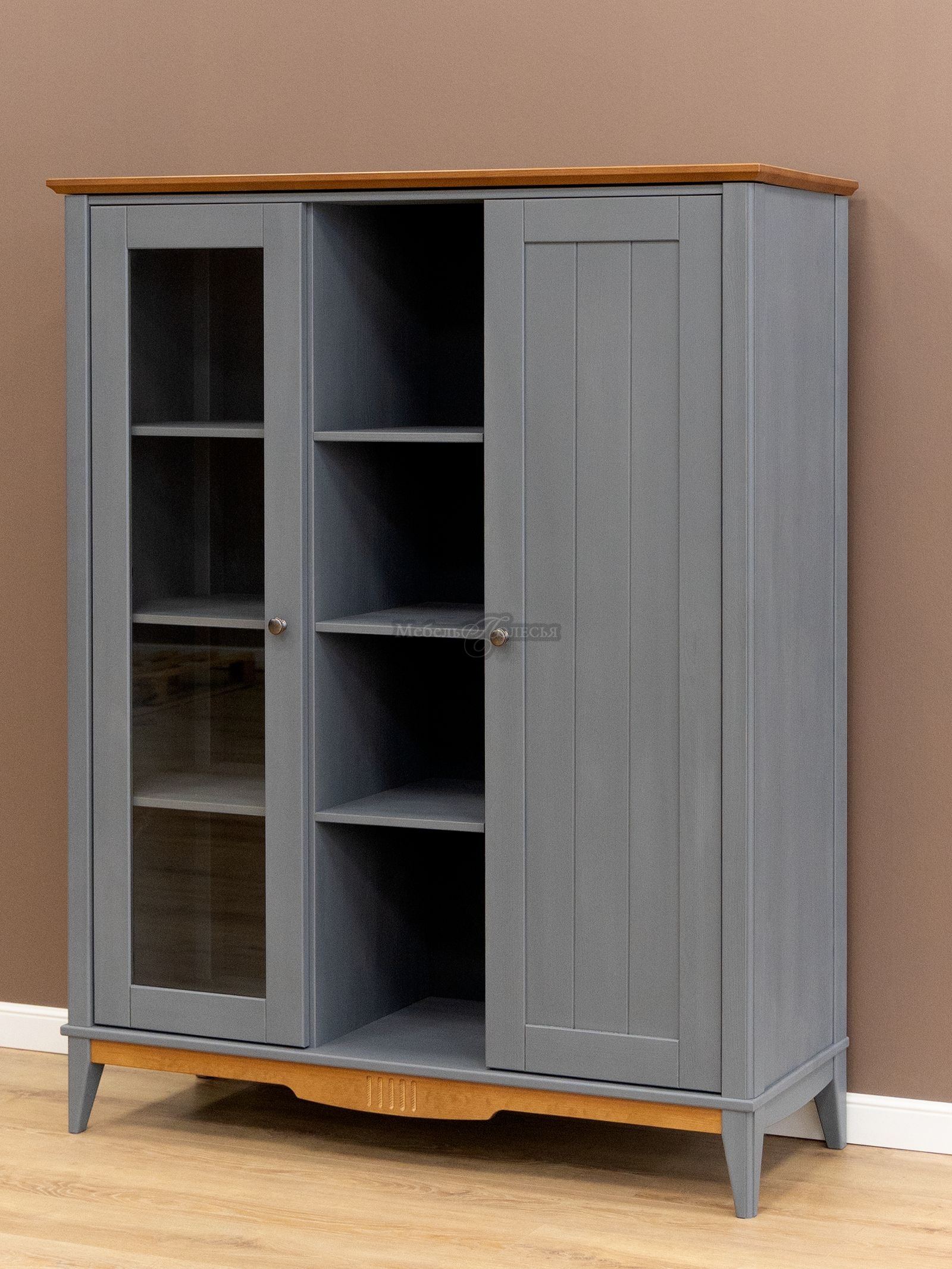 Корпус и фасады изготовлены из массива сосны. Задняя стенка шкафа выполнена из неокрашенной ДВП. Шкаф имеет три секции, в каждой из которых есть по 3 съемных полки. Левая секция с остекленной дверцей, центральная открытая, а правая с глухой дверцей. Дверные петли марки Hettich оборудованы доводчиками для плавного бесшумного закрывания. Высота от пола до края нижней планки 12 см, с уборкой под шкафом справится робот-пылесос.