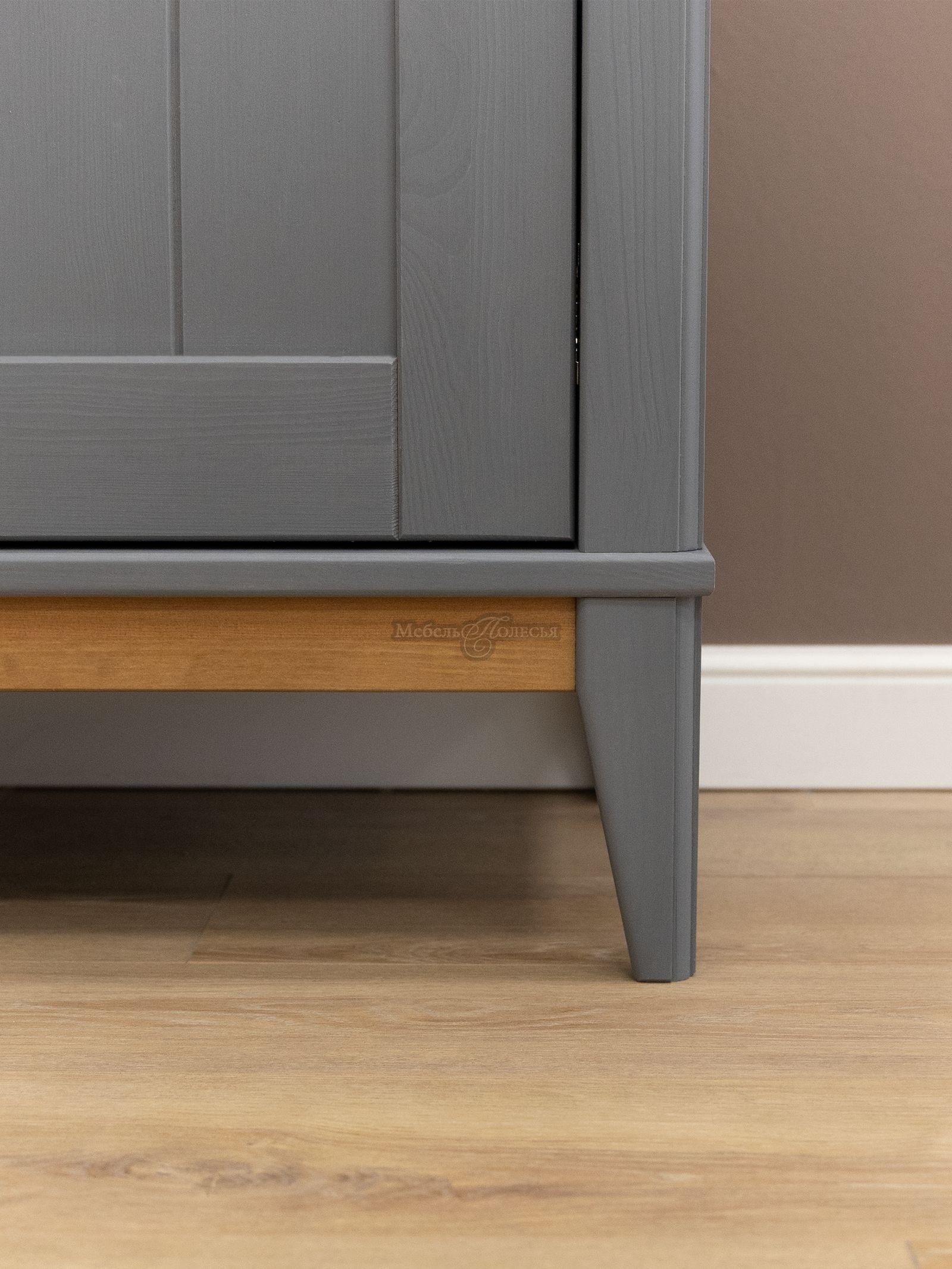 Корпус шкафа, фасады и полки окрашены в нейтральный серый цвет. Дизайн шкафа оживляют карниз и нижняя декоративная планка в цвете антик. Другие варианты отделки этого шкафа: «белый воск/антик» и «черный/антик». Для покрытия используются стойкие и неаллергенные красители шведского бренда Becker Acroma. Немного винтажности добавляют металлические ручки с эффектом старения. Фасады и нижняя планка декорированы фрезеровкой.