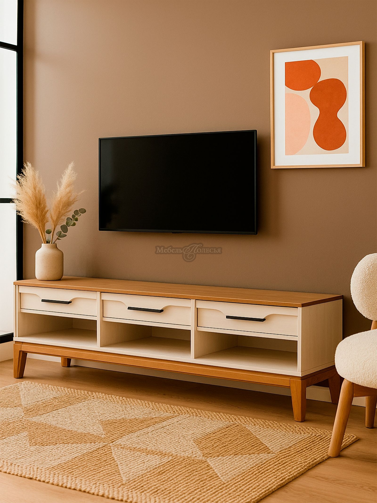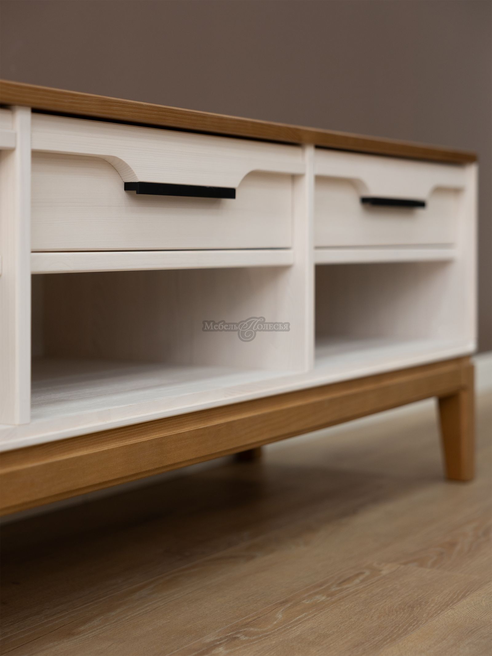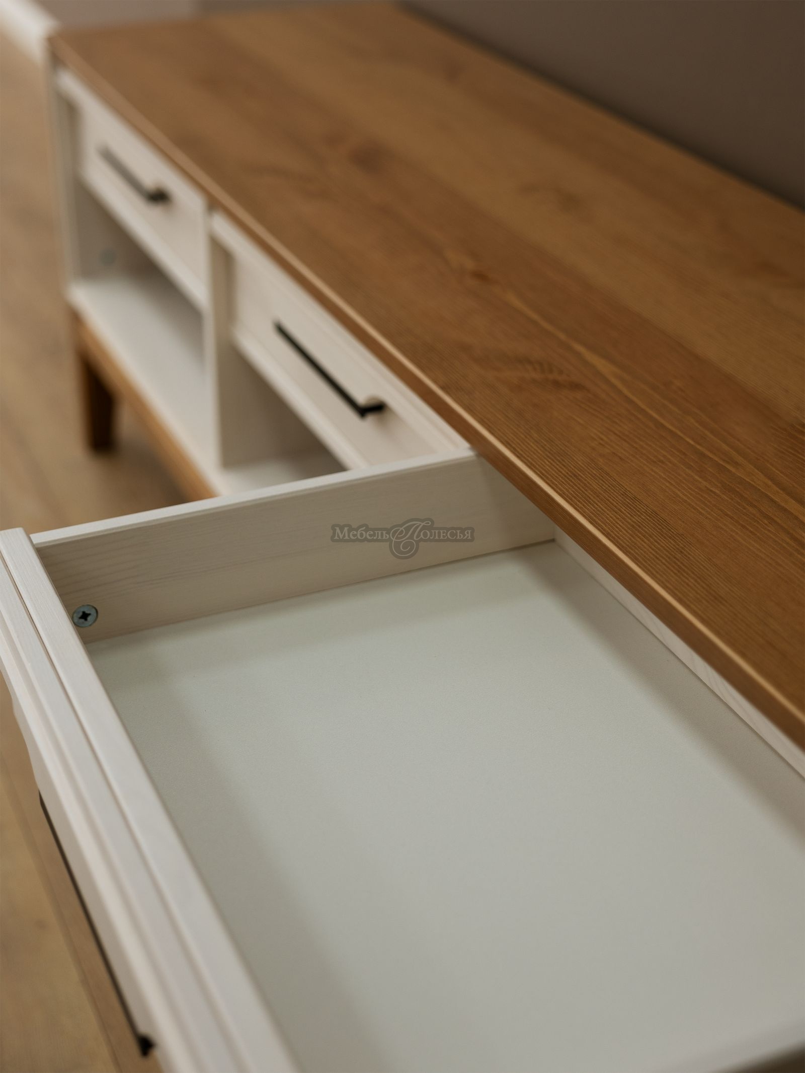 Тумба для телевизора имеет основание с высокими крепкими ножками, которые обеспечивают ей устойчивость. Кроме того, тумбу не нужно сдвигать во время уборки: под ней остается достаточно пространства, в том числе для уборки роботом-пылесосом. В задней стенке предусмотрены отверстия для вывода проводов. На ящиках чёрные профильные ручки.