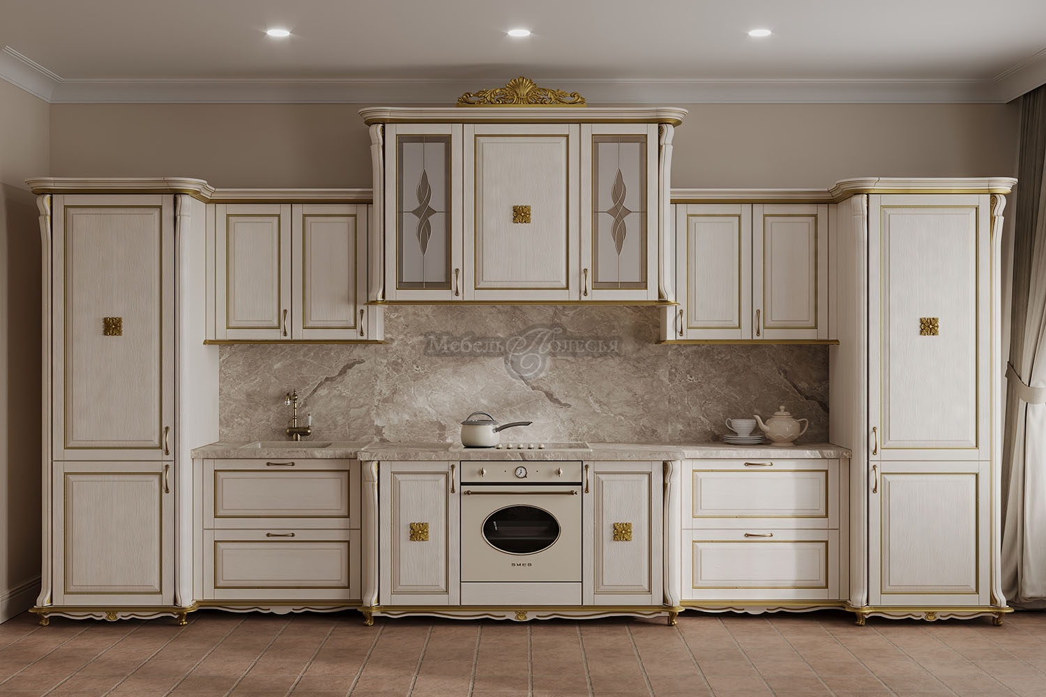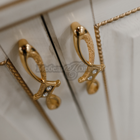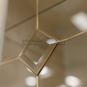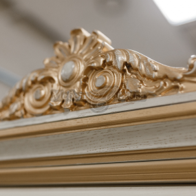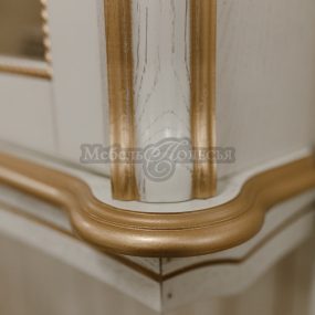 Всем своим внешним видом она отсылает к определенным канонам красоты и эстетики классической мебели. Множество дополнительных декоративных элементов: балюстрады, короны, пилястры, карниз, витражные вставки, световая планка, резной подиум для нижних шкафов.