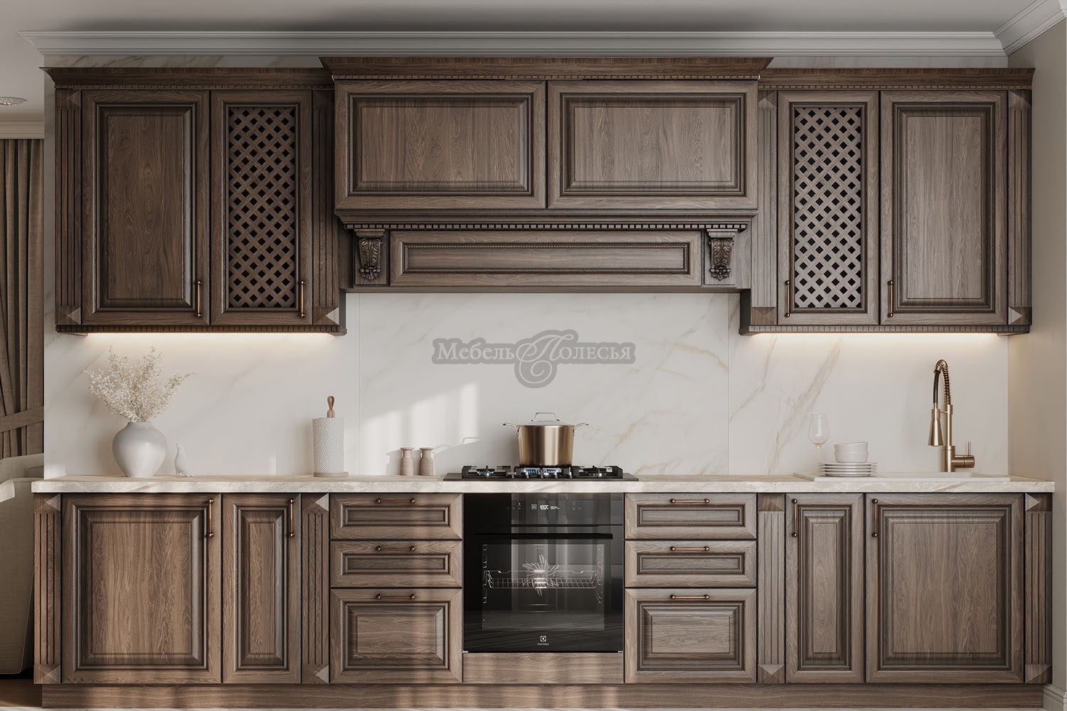 В лучших традиция классического дизайна «Ирина» имеет много изящных декоративных элементов, которые вы можете комбинировать самостоятельно: балюстрады для открытых полок, резные пилястры, окантовка верха карнизом, витражные вставки, решетка на дверцах шкафов и световая планка.