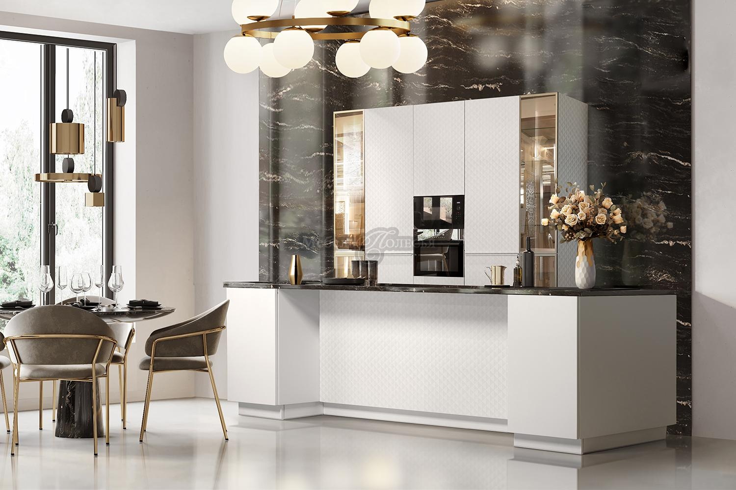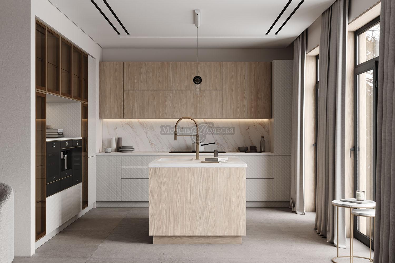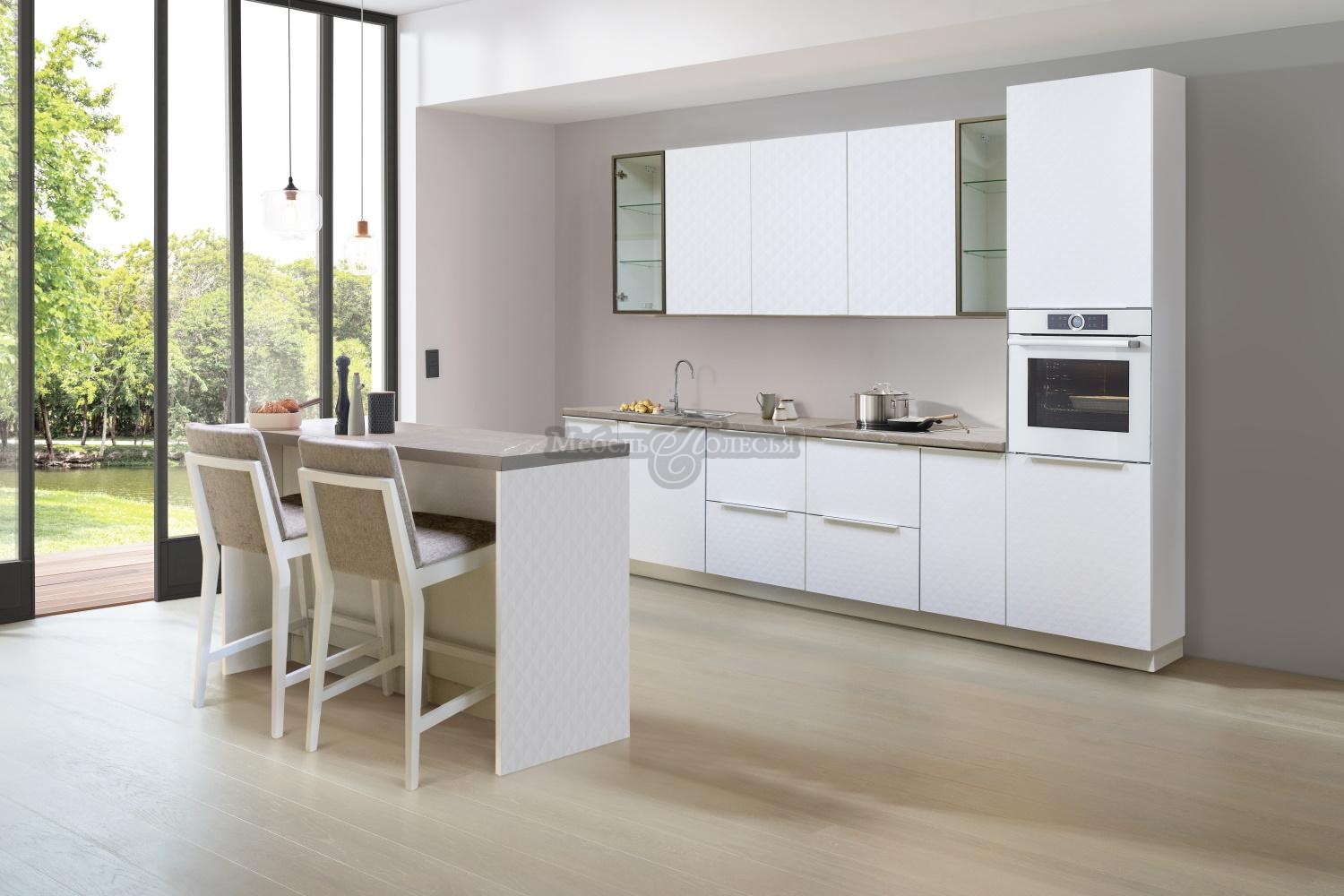 Корпуса, фасады, петли с доводчиком, выдвижные системы с доводчиком, ЛДСП над вытяжкой, посудосушитель шириной 60 см, карниз из массива по лицевой части кухни, влагостойкая столешница толщиной 38 мм (облицовка торца кромкой в тон столешницы), пластиковый цоколь, планка для навески шкафов