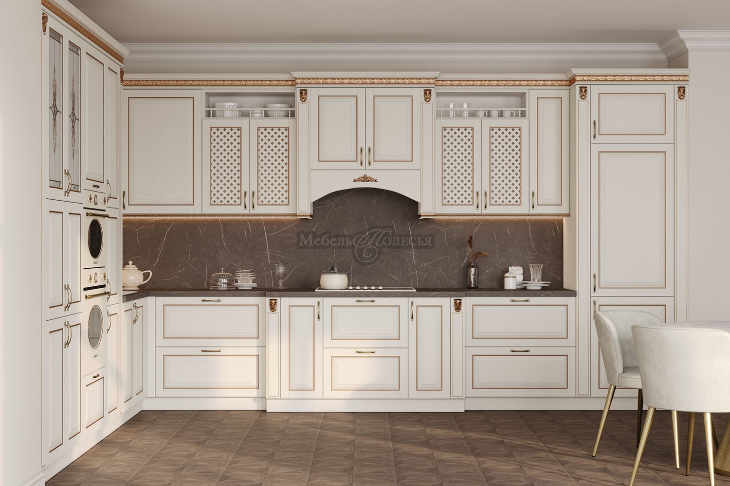 Корпуса, фасады, петли с доводчиком, выдвижные системы с доводчиком, ЛДСП над вытяжкой, посудосушитель шириной 60 см, карниз из массива по лицевой части кухни, влагостойкая столешница толщиной 38 мм (облицовка торца кромкой в тон столешницы), пластиковый цоколь, планка для навески шкафов