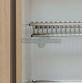 Корпуса, фасады, петли с доводчиком, выдвижные системы с доводчиком, ЛДСП над вытяжкой, посудосушитель шириной 60 см, карниз из массива по лицевой части кухни, влагостойкая столешница толщиной 38 мм (облицовка торца кромкой в тон столешницы), пластиковый цоколь, планка для навески шкафов