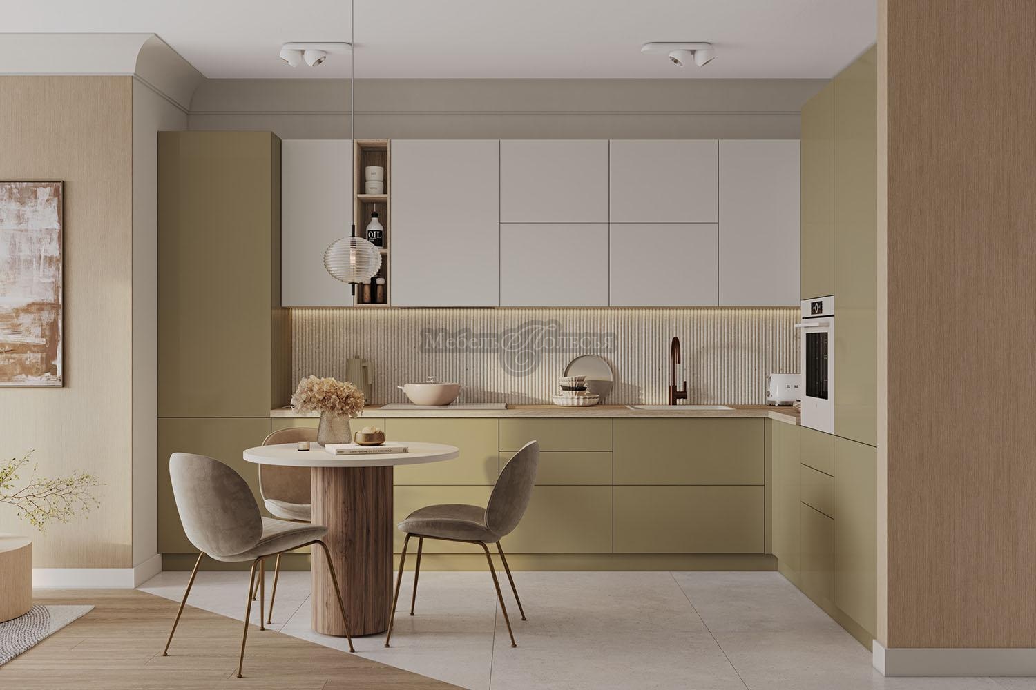 Фасады - крашенный МДФ. Для покрытия применяются экологичные лакокрасочные материалы. Палитра цветов разнообразна и каждый может выбрать подходящий вариант, уникальное сочетание оттенков для своего интерьера. Лаконичное оформление дополнено креативным и функциональным решением: отсутствует лицевая фурнитура, она заменена скрытым механизмом открывания Push to open (пуш ту опен). Очень удобный и практичный вариант, так как обеспечивает лёгкий доступ к содержимому шкафов, буквально в одно нажатие. А еще это отличная возможность создать ультрасовременный минималистичный интерьер с идеально гладкими однотонными фасадами без лишних деталей.