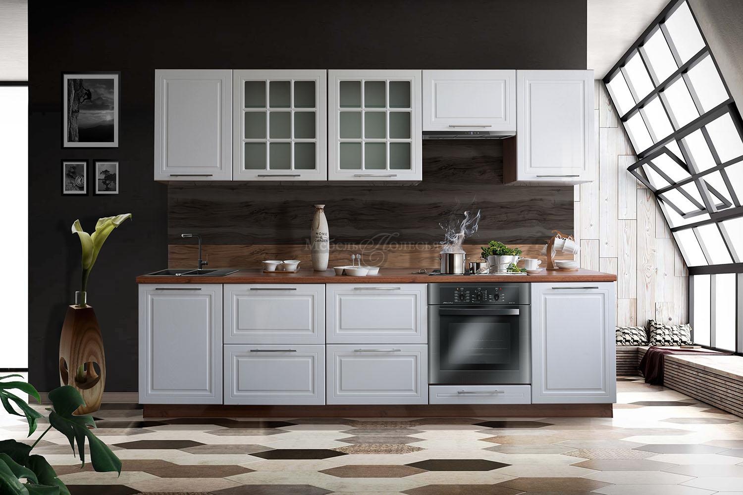 Корпуса, фасады, петли с доводчиком, выдвижные системы с доводчиком, ЛДСП над вытяжкой, посудосушитель шириной 60 см, карниз из массива по лицевой части кухни, влагостойкая столешница толщиной 38 мм (облицовка торца кромкой в тон столешницы), пластиковый цоколь, планка для навески шкафов