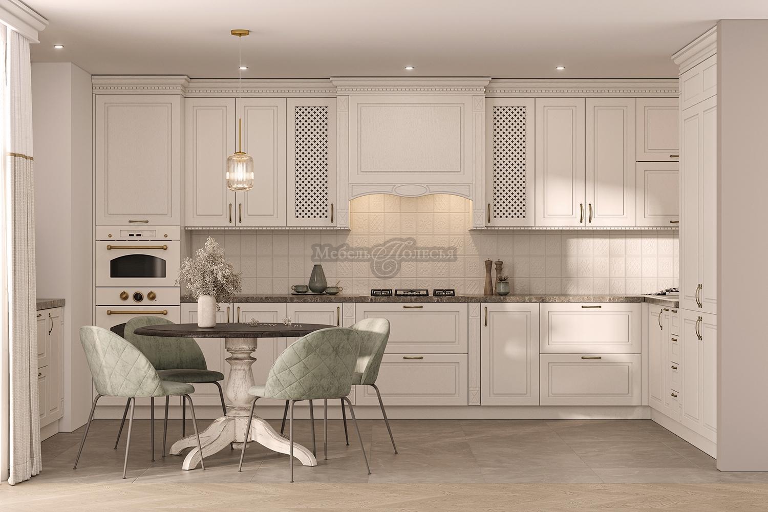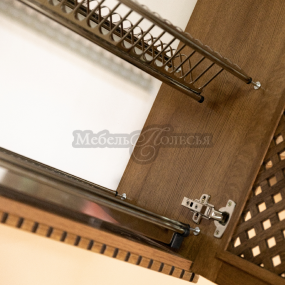 Корпуса, фасады, петли с доводчиком, выдвижные системы с доводчиком, ЛДСП над вытяжкой, посудосушитель шириной 60 см, карниз из массива по лицевой части кухни, влагостойкая столешница толщиной 38 мм (облицовка торца кромкой в тон столешницы), пластиковый цоколь, планка для навески шкафов