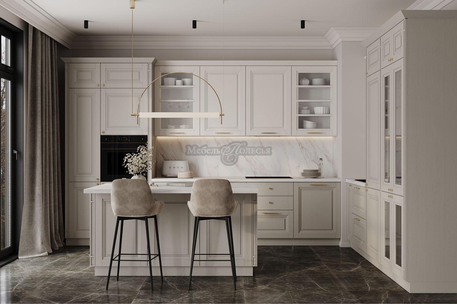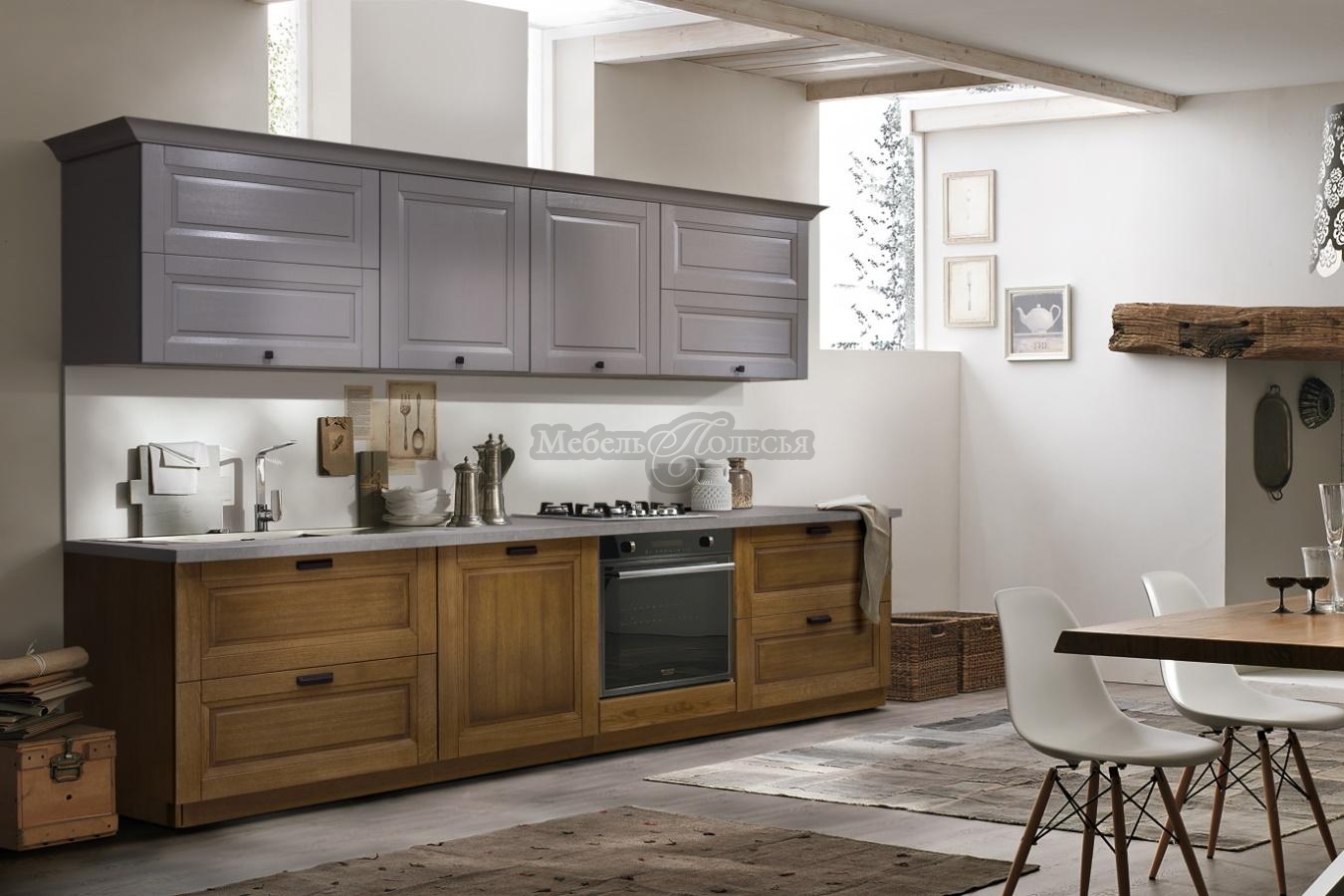 Коллекция «Жизель» - это уникальная комбинация классического стиля и современности. Фасады выполнены из массива и шпона дуба. Сочетание мягкой, природной текстуры натурального дерева и строгой декоративной рамки на фасадах можно разбавить балюстрадой и карнизом. Также в коллекции присутствует вариант декорирования фасадов витражной вставкой.
