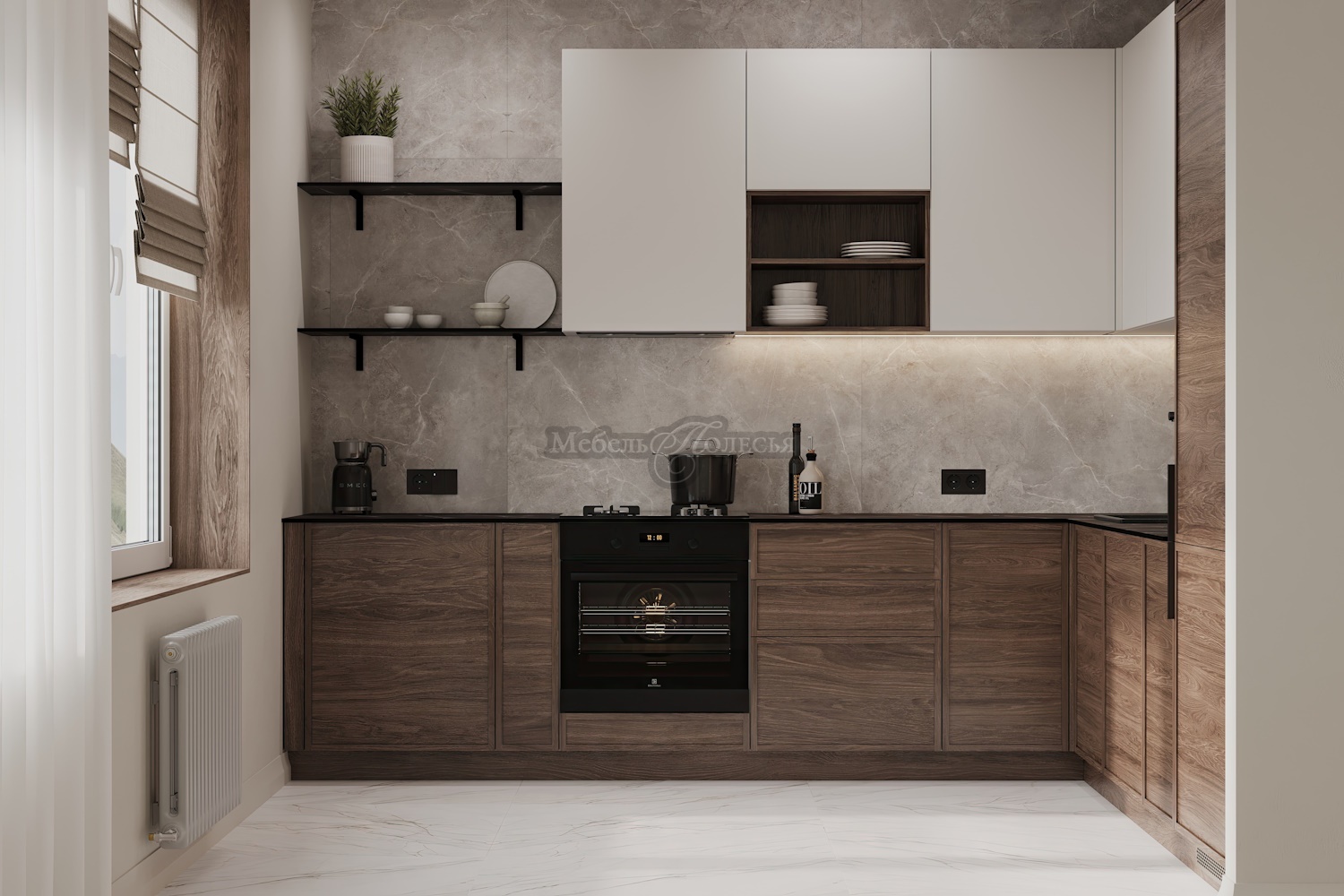 Корпуса, фасады, петли с доводчиком, выдвижные системы с доводчиком, ЛДСП над вытяжкой, посудосушитель шириной 60 см, карниз из массива по лицевой части кухни, влагостойкая столешница толщиной 38 мм (облицовка торца кромкой в тон столешницы), пластиковый цоколь, планка для навески шкафов