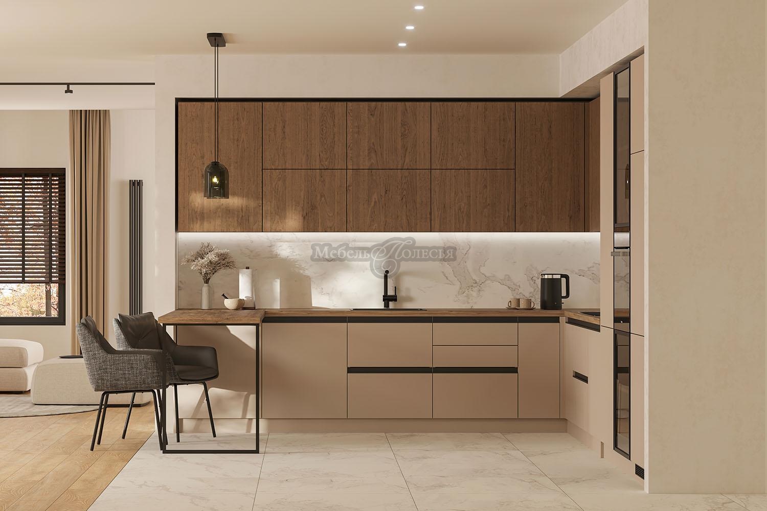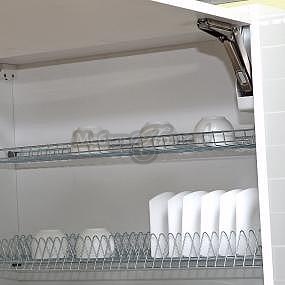 Корпуса, фасады, петли с доводчиком, выдвижные системы с доводчиком, ЛДСП над вытяжкой, посудосушитель шириной 60 см, карниз из массива по лицевой части кухни, влагостойкая столешница толщиной 38 мм (облицовка торца кромкой в тон столешницы), пластиковый цоколь, планка для навески шкафов