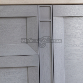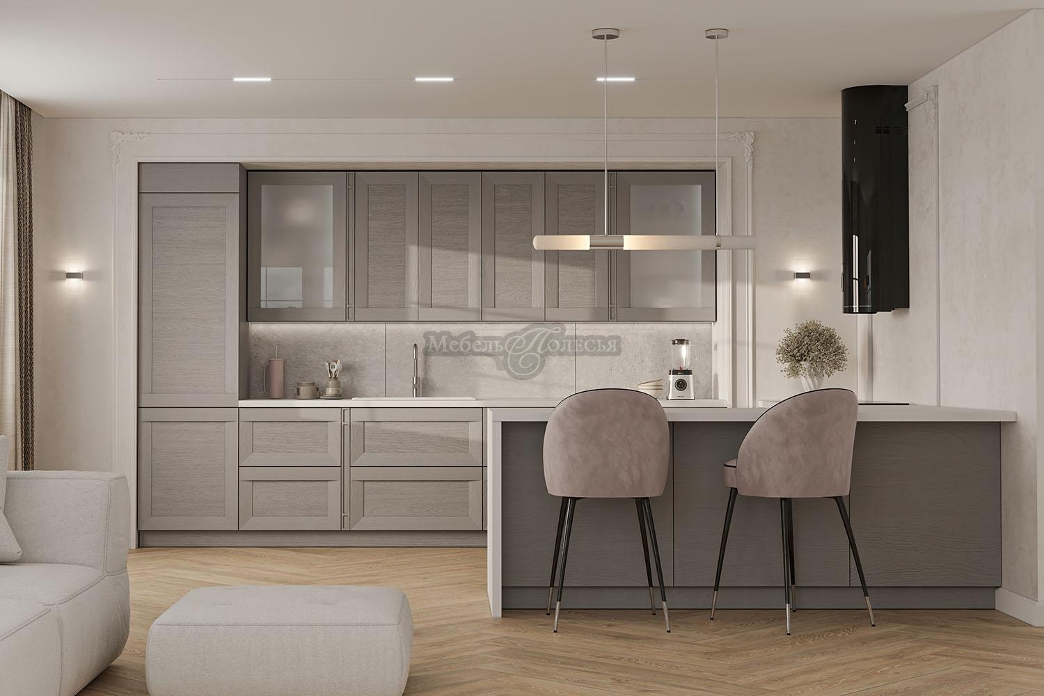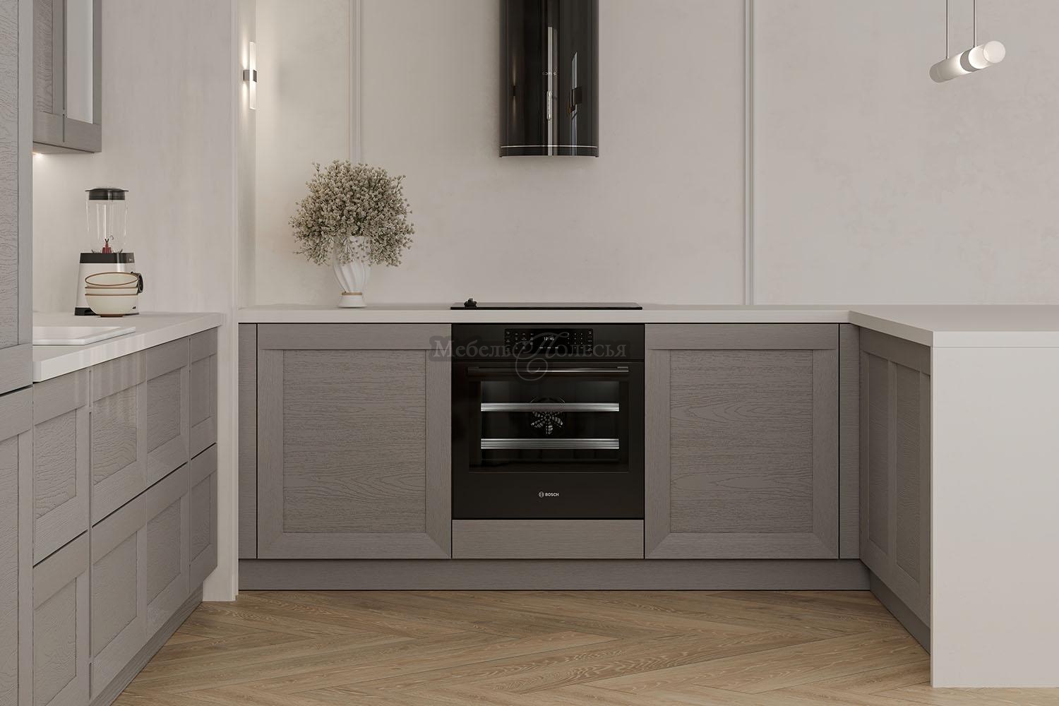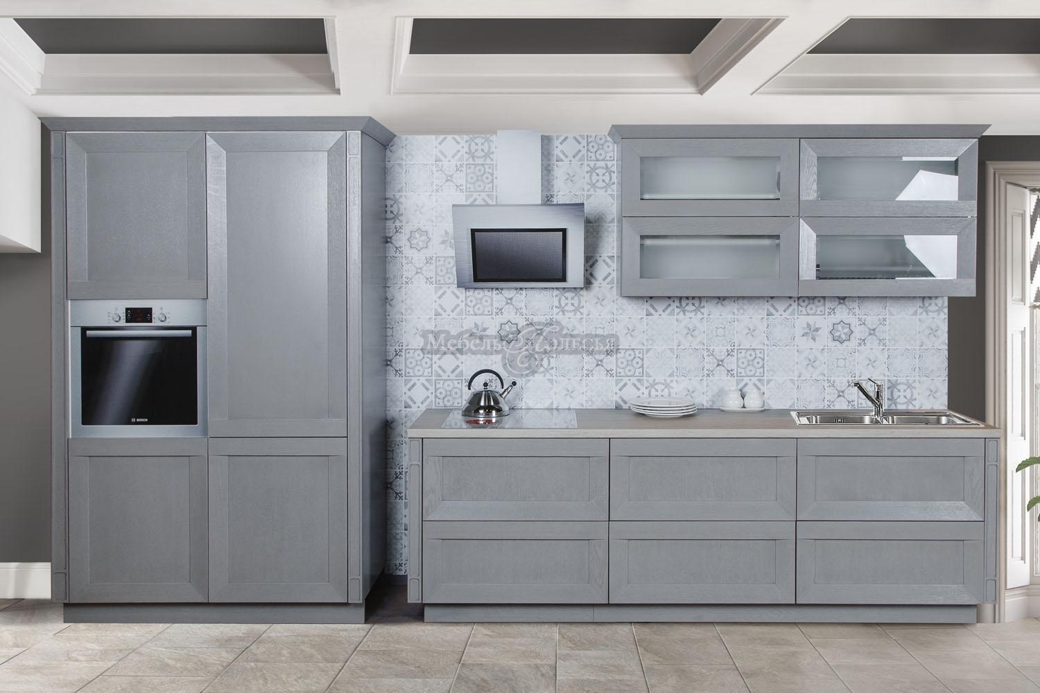 Сдержанные рамочные фасады с ярко выраженной текстурой натурального дерева, лаконичный карниз, декоративные элементы в виде пилястр и витражных вставок придадут кухне легкий и утонченный вид.