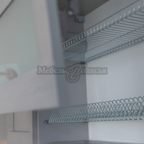 Корпуса, фасады, петли с доводчиком, выдвижные системы с доводчиком, ЛДСП над вытяжкой, посудосушитель шириной 60 см, карниз из массива по лицевой части кухни, влагостойкая столешница толщиной 38 мм (облицовка торца кромкой в тон столешницы), пластиковый цоколь, планка для навески шкафов