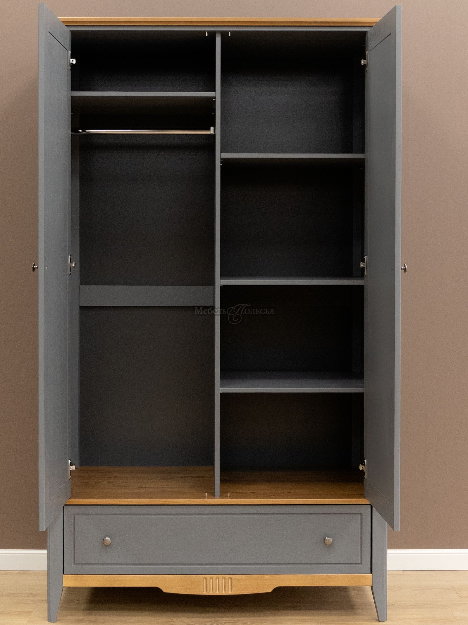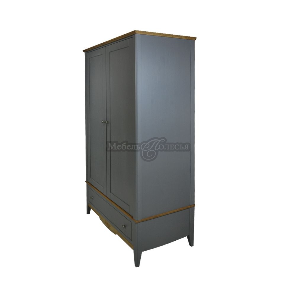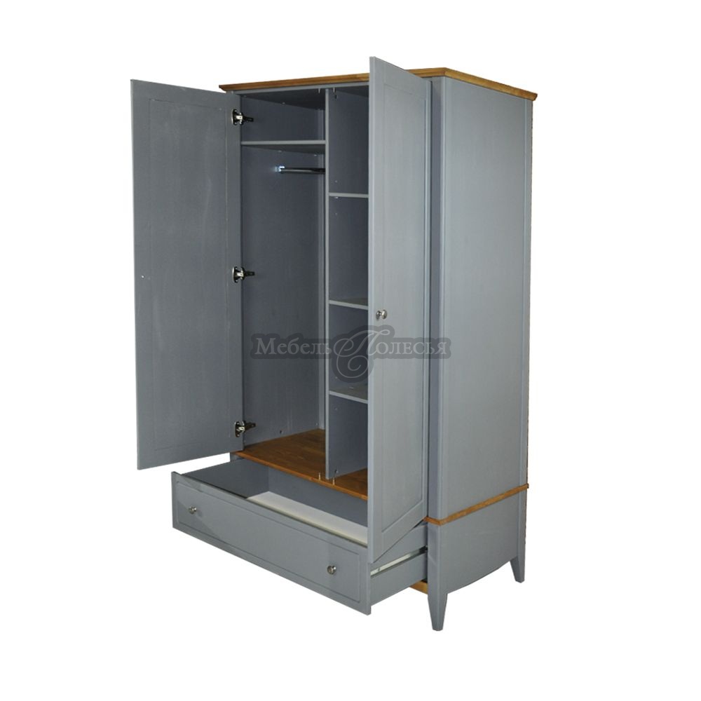 Оригинальным дизайном: корпус шкафа в строгом сером цвете, а карниз, перекрытие между основным отделением и ящиком и нижняя декоративная планка в цвете антик, через покрытие антик видна текстура сосны. Фасады украшены фрезеровкой, в комплекте металлические ручки-кнопки с искусственным старением. Дно ящика изготовлено из ламинированного белого оргалита, стенки ящика сделаны из массива сосны, выкрашены в цвет корпуса.