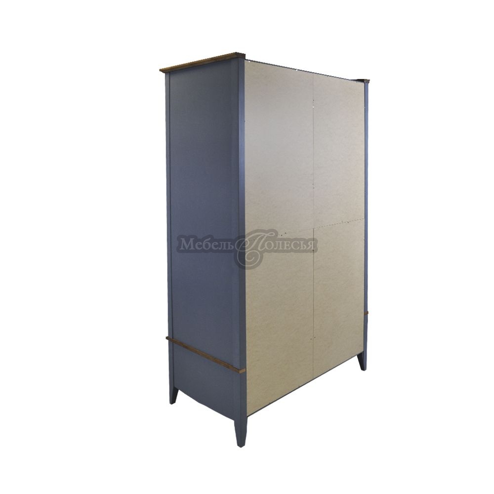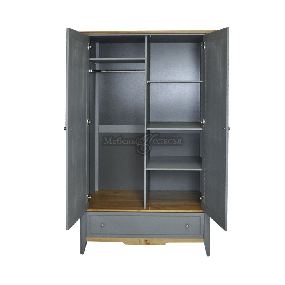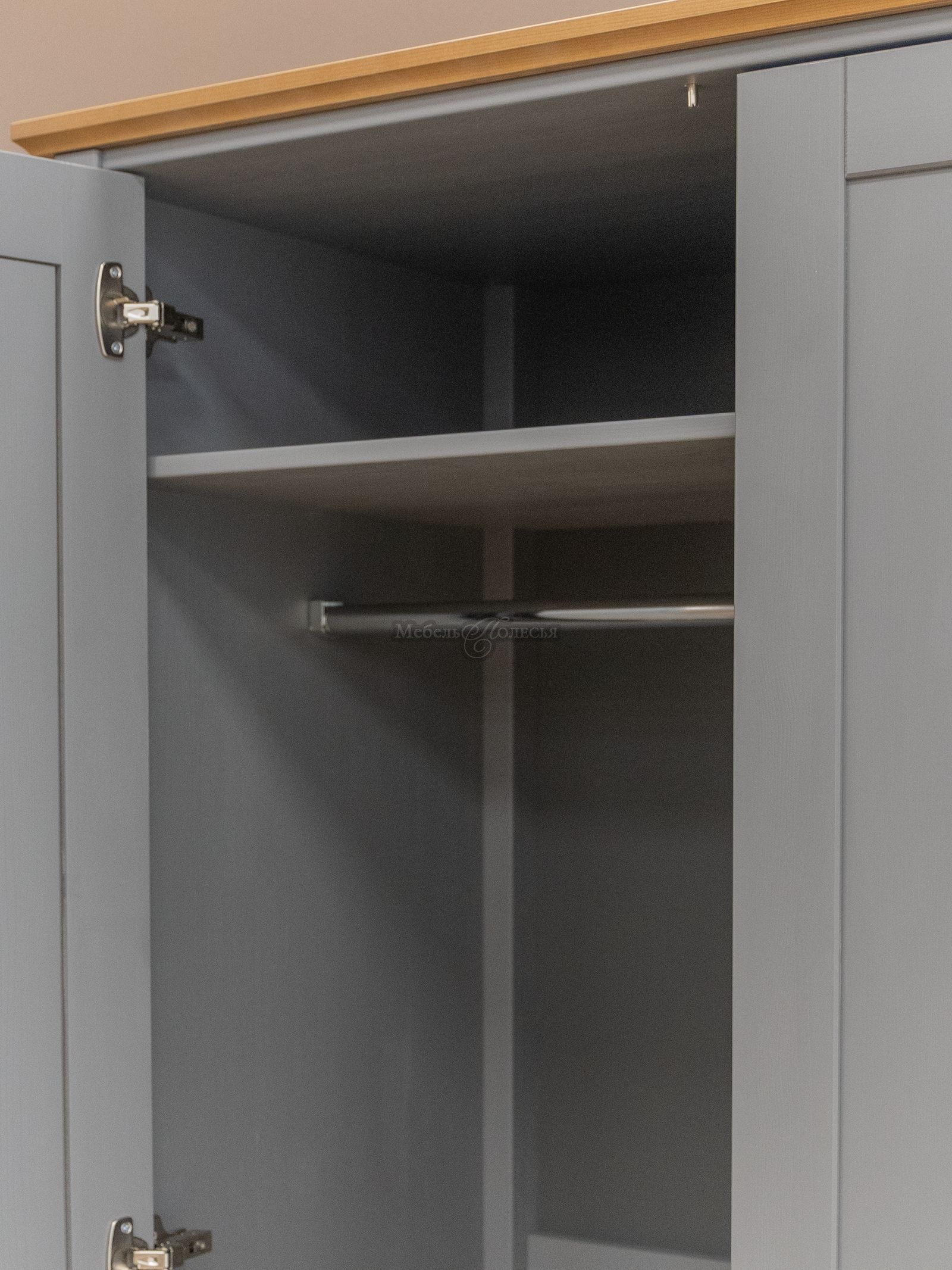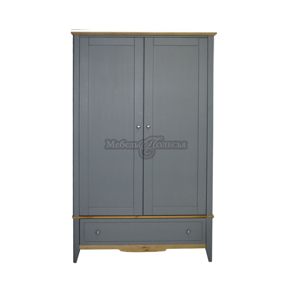 Оригинальным дизайном: корпус шкафа в строгом сером цвете, а карниз, перекрытие между основным отделением и ящиком и нижняя декоративная планка в цвете антик, через покрытие антик видна текстура сосны. Фасады украшены фрезеровкой, в комплекте металлические ручки-кнопки с искусственным старением. Дно ящика изготовлено из ламинированного белого оргалита, стенки ящика сделаны из массива сосны, выкрашены в цвет корпуса.