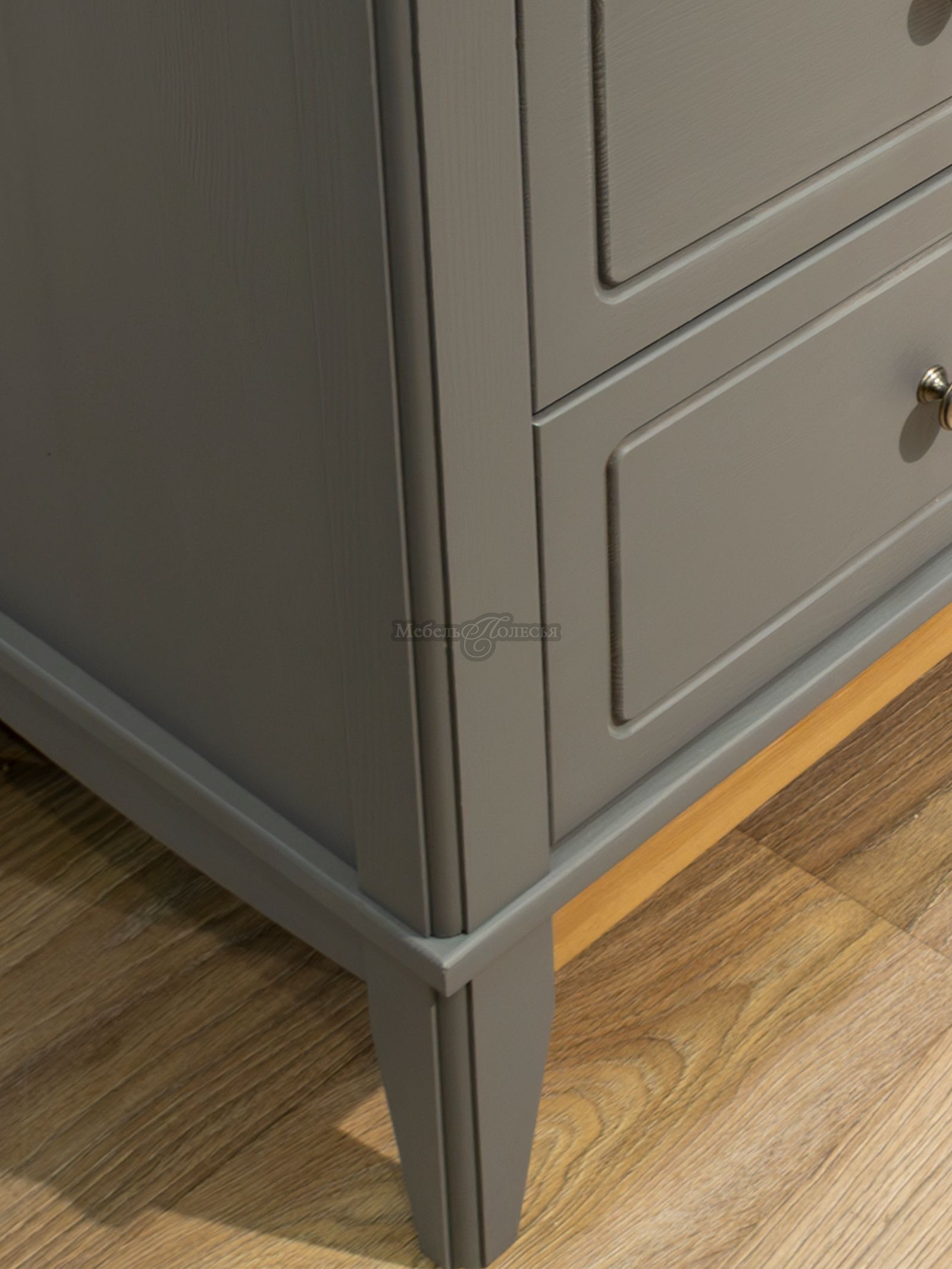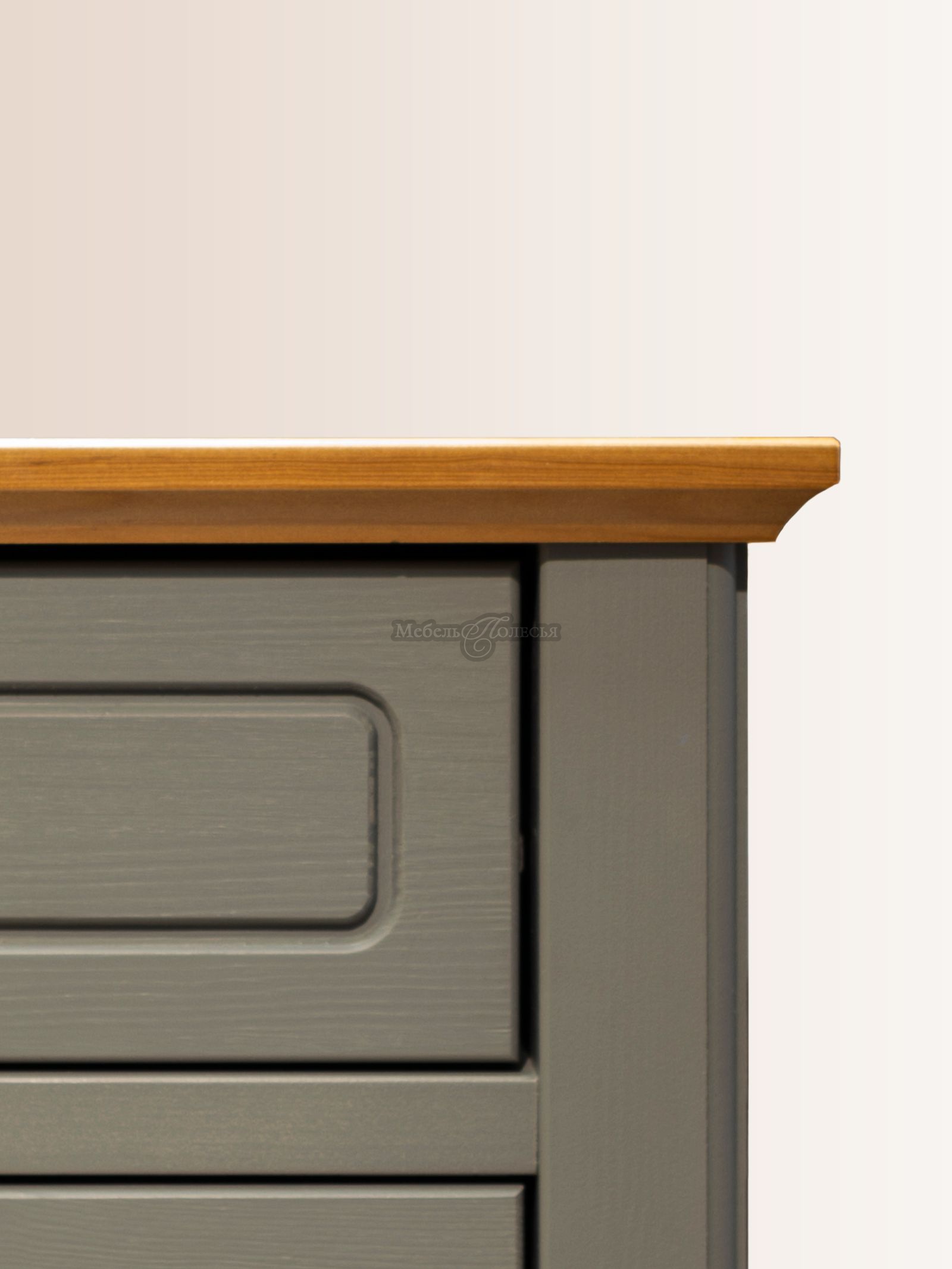 Столешница и нижняя декоративная планка под тумбой окрашены в цвет антик (светло-коричневый), через него просматривается текстура дерева. Корпус и фасады в строгом, но приятном для глаз сером цвете. Для окрашивания применяются матовые лаки на водной основе от шведской компании Becker Acroma. Лаки соответствуют европейским стандартам качества, не пахнут и не провоцируют аллергию.