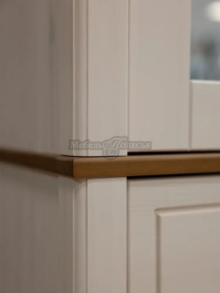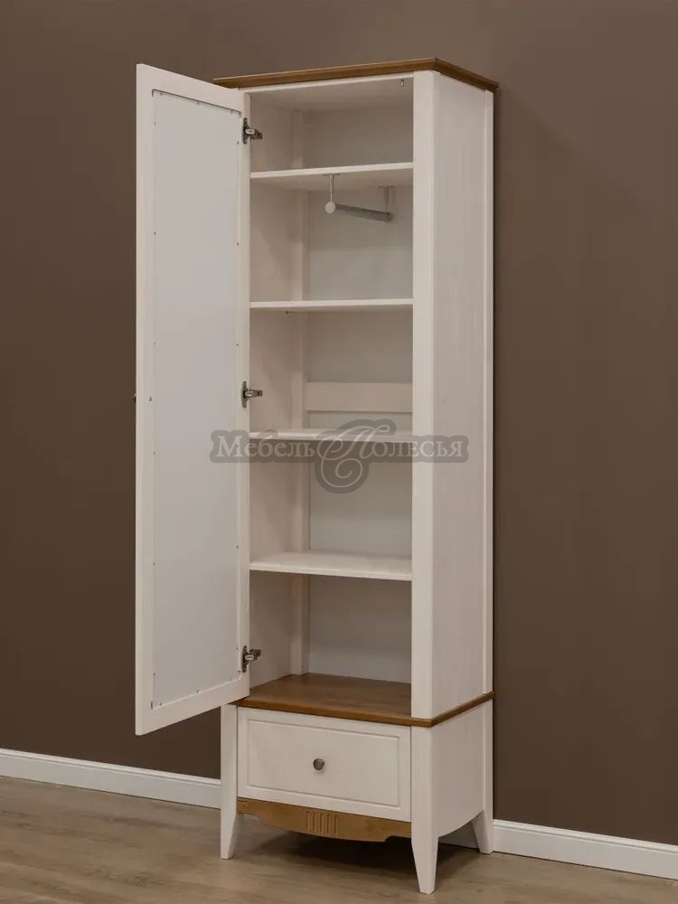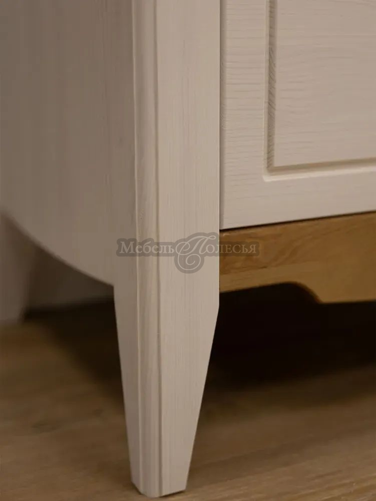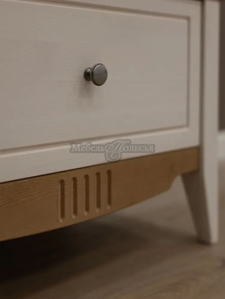Корпус и фасады шкафа изготовлены из массива сосны, дно ящика из оргалита. Корпус и фасады окрашены в белый цвет, а карниз, перекрытие над ящиком и нижняя планка – в цвет антик. Эта же модель доступна в других отделках: «серый/антик» и «черный/антик». Через покрытие антик можно рассмотреть природную текстуру сосны. Фасады шкафа, нижняя планка и ножки декорированы фрезеровкой, в неброском дизайне отлично смотрятся металлические ручки-кнопки с эффектом старения. Стенки ящика окрашены в цвет корпуса и фасадов. Для отделки используются красители шведской компании Becker Acromа. Лаки сертифицированы по европейским стандартам качества, они стойкие, не пахнут и безопасны для аллергиков.