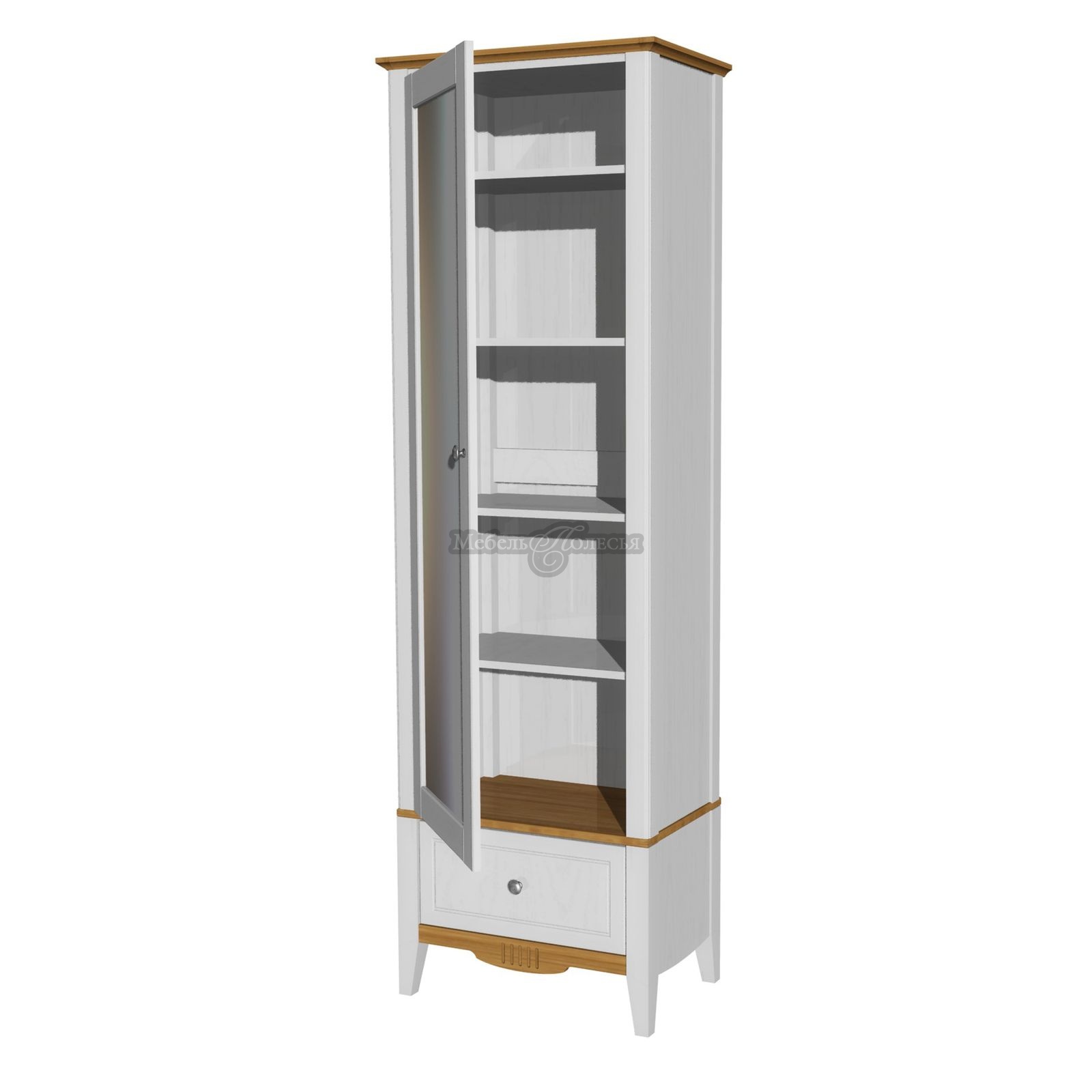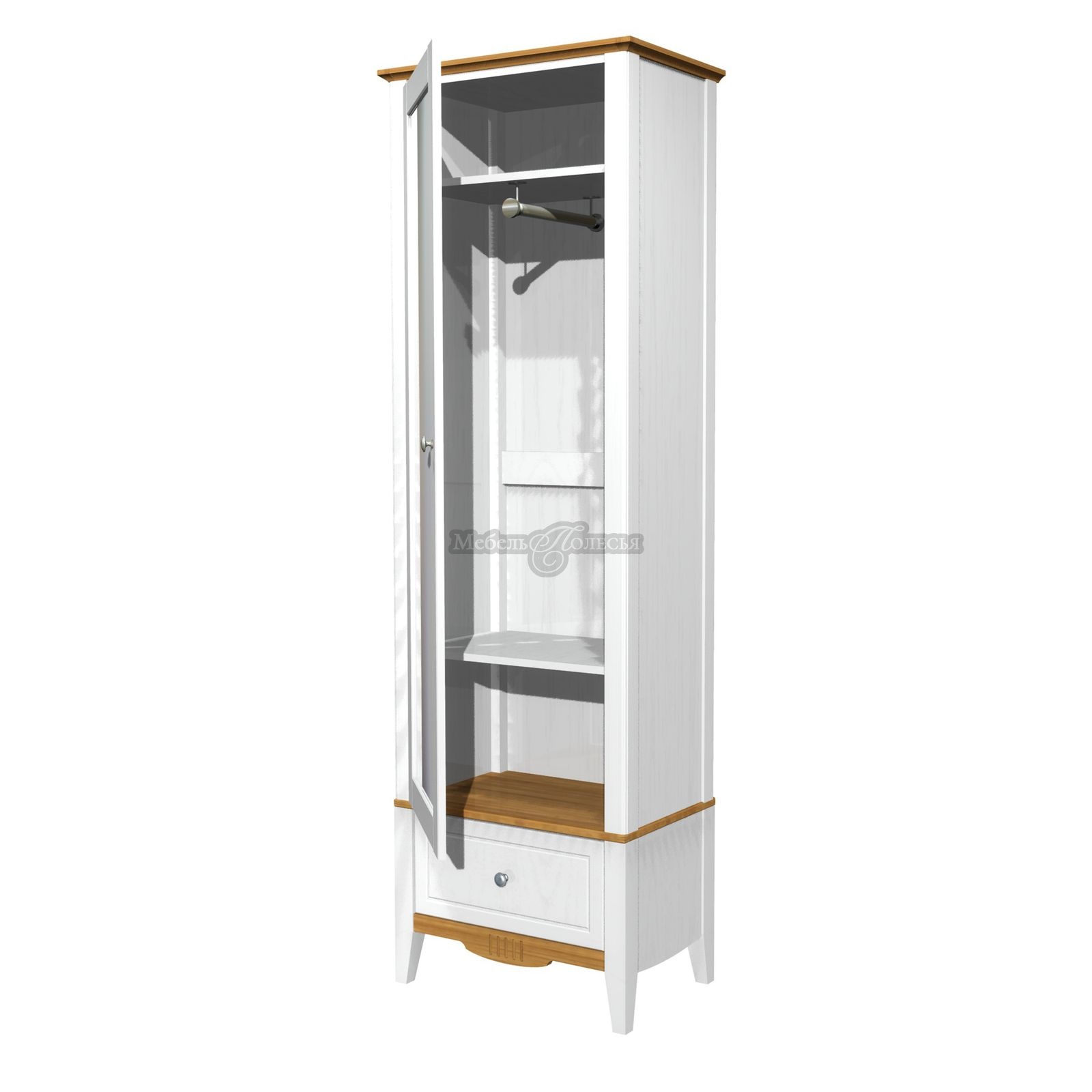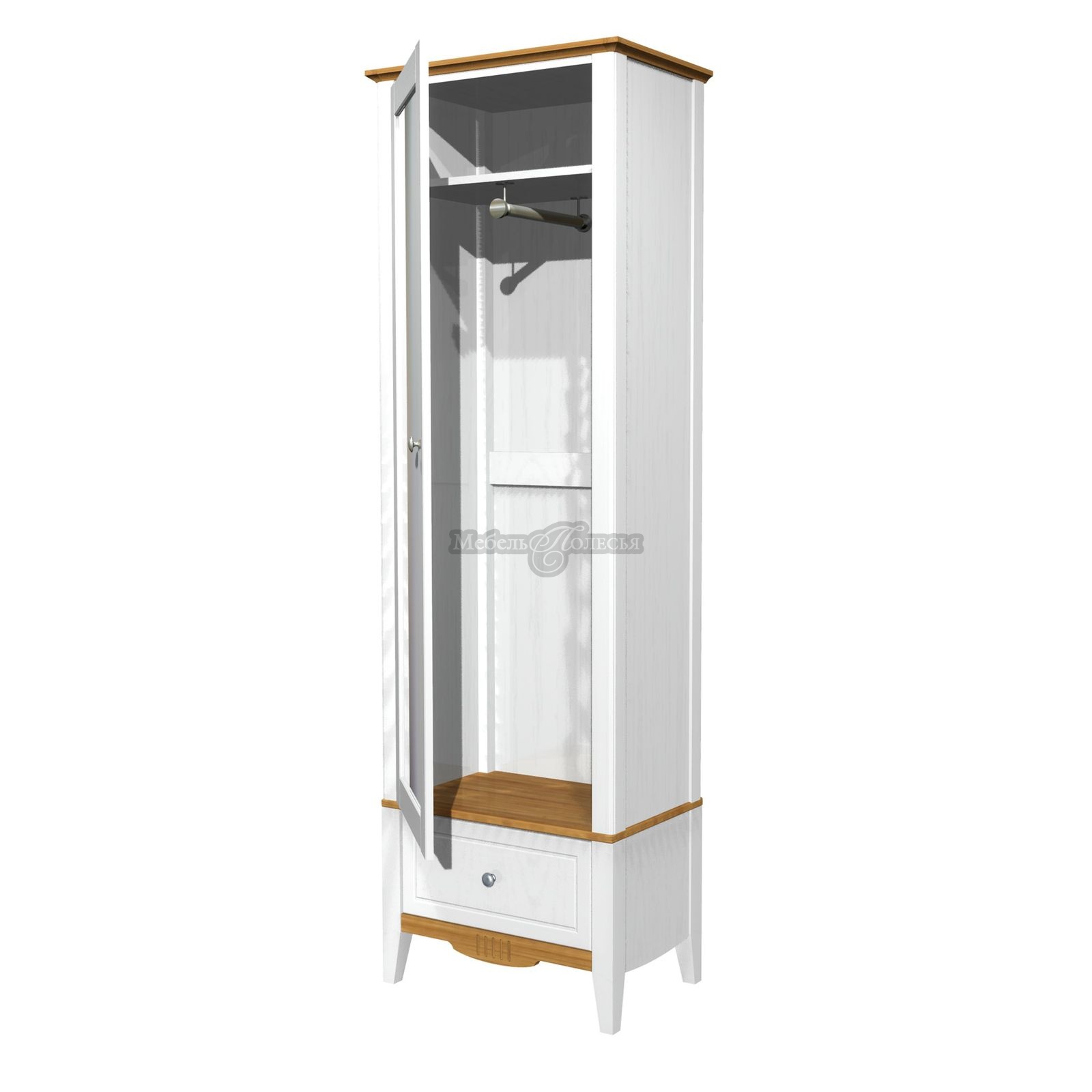 Корпус и фасады шкафа изготовлены из массива сосны, дно ящика из оргалита. Корпус и фасады окрашены в белый цвет, а карниз, перекрытие над ящиком и нижняя планка – в цвет антик. Эта же модель доступна в других отделках: «серый/антик» и «черный/антик». Через покрытие антик можно рассмотреть природную текстуру сосны. Фасады шкафа, нижняя планка и ножки декорированы фрезеровкой, в неброском дизайне отлично смотрятся металлические ручки-кнопки с эффектом старения. Стенки ящика окрашены в цвет корпуса и фасадов. Для отделки используются красители шведской компании Becker Acromа. Лаки сертифицированы по европейским стандартам качества, они стойкие, не пахнут и безопасны для аллергиков.
