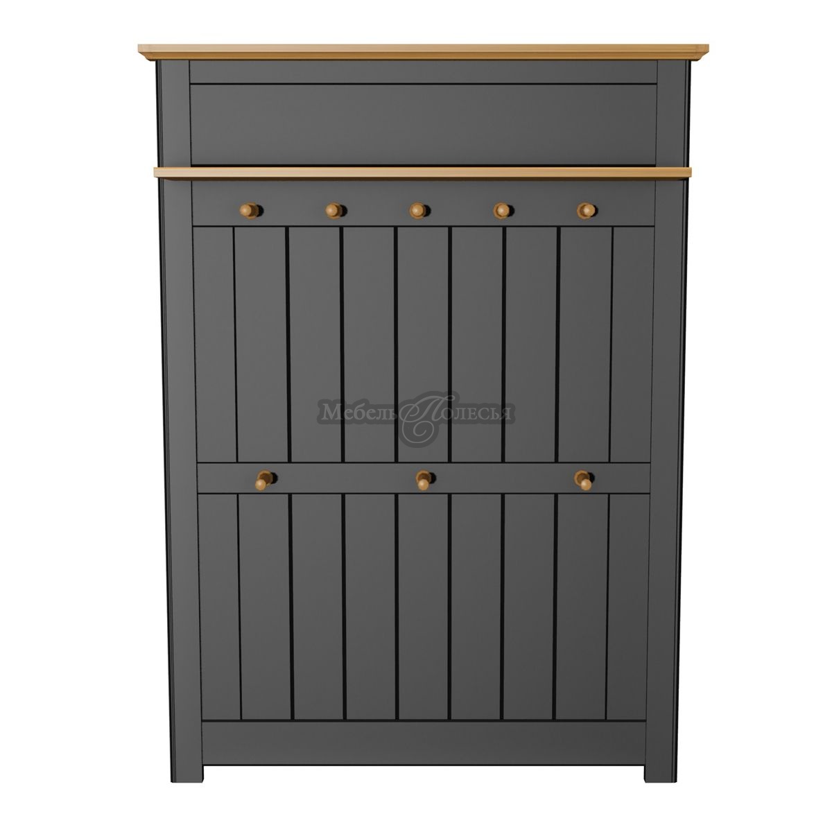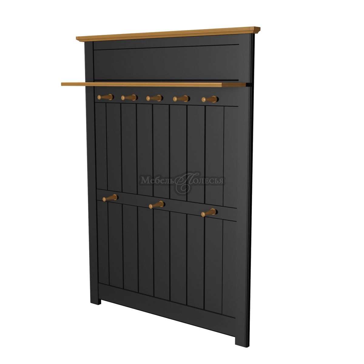 К панели крепятся 8 деревянных крючков для верхней одежды, сумок и зонтов, а также полка для головных уборов, варежек, перчаток. Панель вешалки выполнена в черном цвете, а карниз, крючки и шляпная полка в цвете антик. Другие варианты окрашивания: «белый воск/антик» и «серый/антик». Преимущество мебели «Пенни» – качественные гипоаллергенные лаки на водной основе от известного производителя Backer Acroma (Швеция). Панель вешалки декорирована вертикальной фрезеровкой.