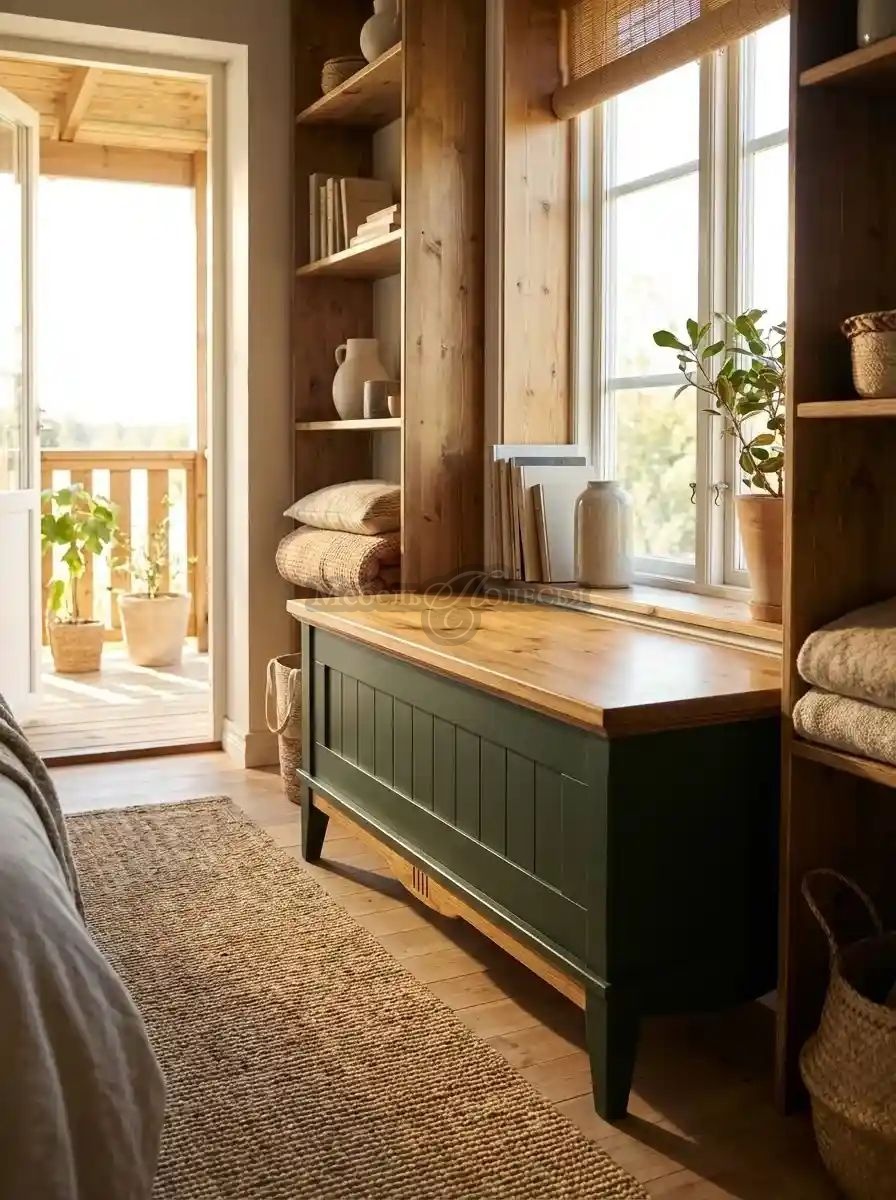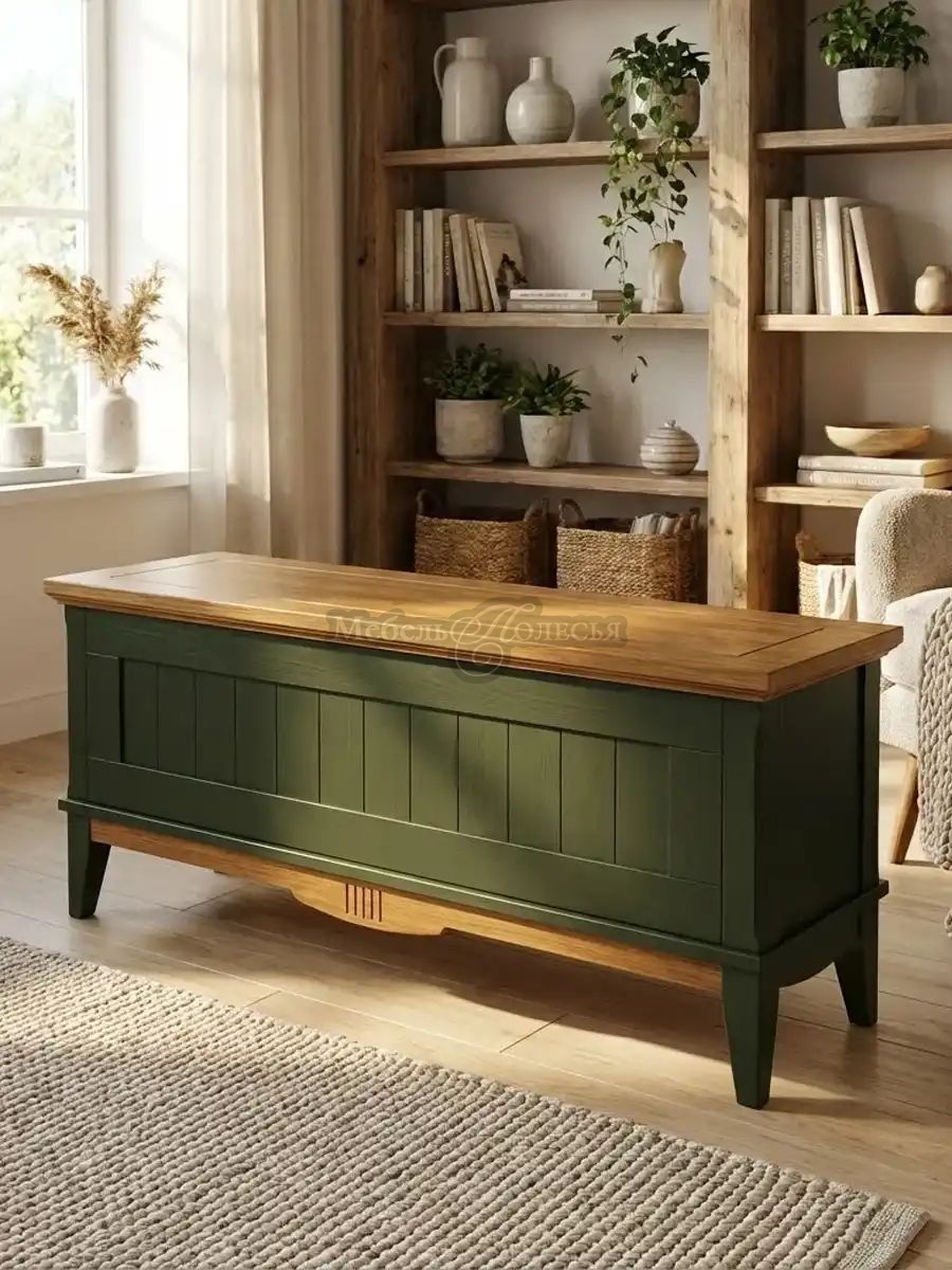 Сундук имеет вместительный внутренний отсек 30х30х128 см и крышку с механизмом фиксирования в открытом положении. Высота от пола до нижней декоративной планки 12 см, под сундуком без проблем проедет небольшой робот-пылесос. На передней стенке и на нижней планке сделана декоративная фрезеровка.