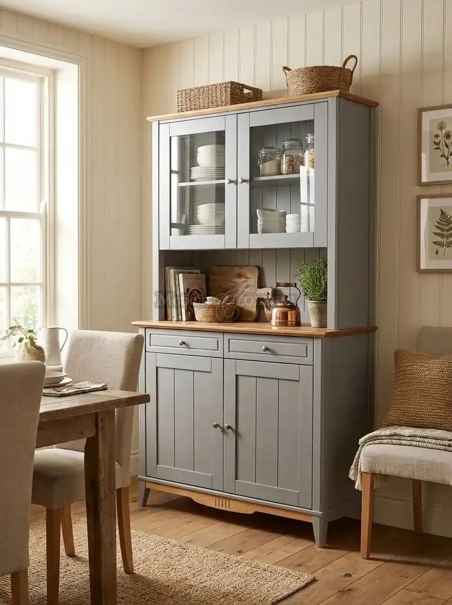 Надстройка имеет отделение для посуды с полкой и двумя остекленными распашными дверцами. Внизу есть пространство, которое при установке на комод образует удобную нишу для кухонных предметов. Фасады и задняя стенка надстройки украшены декоративной фрезеровкой. Дверные петли со встроенными доводчиками закрываются плавно, без хлопков. На дверцах металлические ручки-кнопки с эффектом старения.
