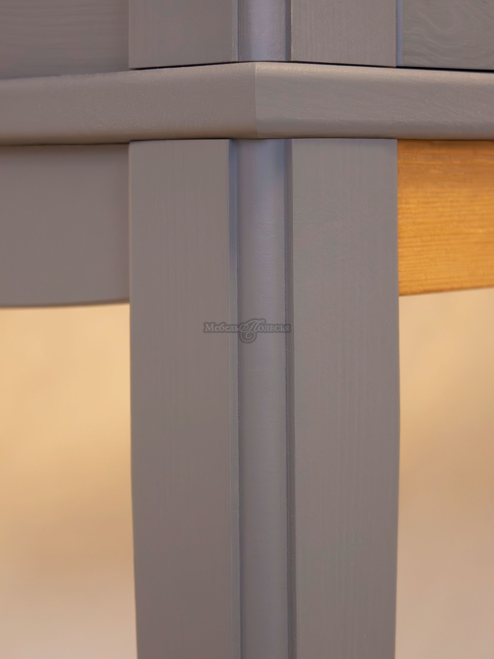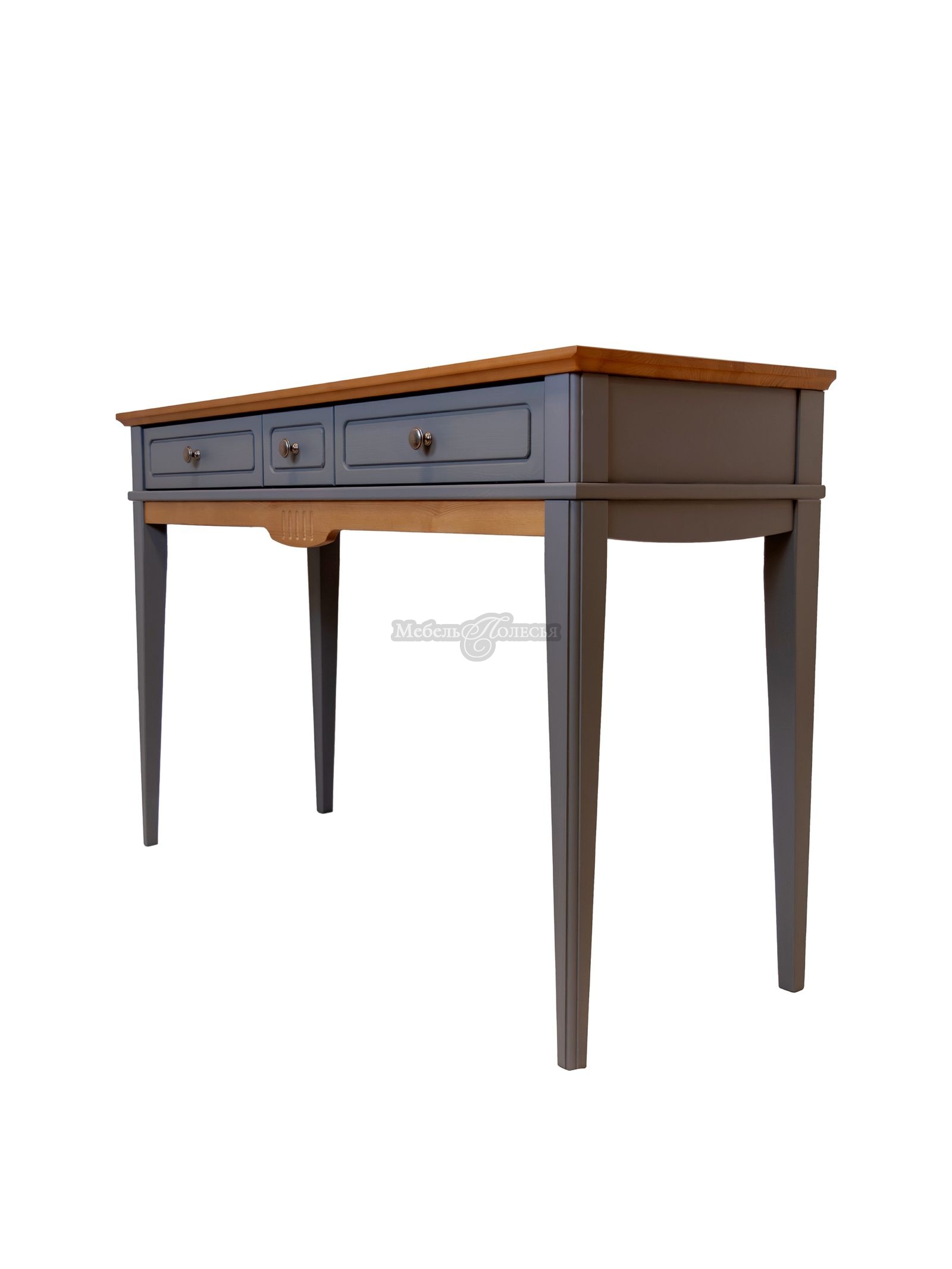 Столик выполнен в двух контрастных цветах, сером и антике (светло-коричневом). В серый цвет окрашены корпус и фасады стола, а в цвет антик – столешница и нижняя декоративная планка. Для отделки применяются матовые лаки от шведской компании Becker Acroma. Лаки не дают сильного запаха, устойчивы и безопасны для здоровья.