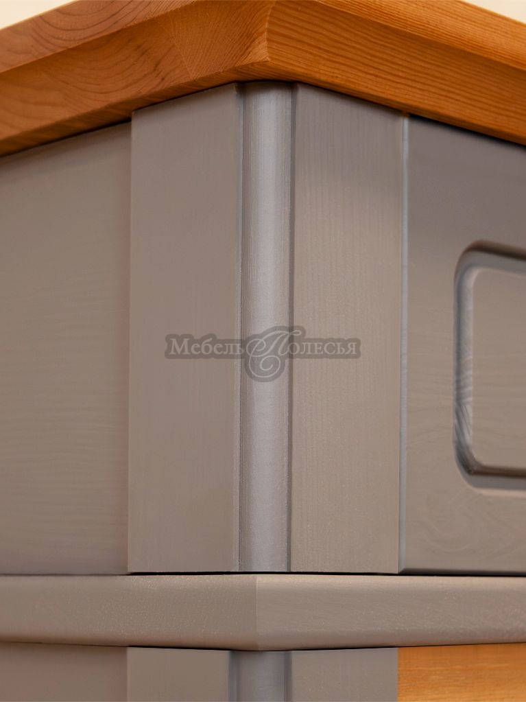 Ящики устанавливаются на шариковых направляющих частичного выдвижения, без доводчиков, два боковых ящика украшены декоративной фрезеровкой. Донья ящиков сделаны из белого оргалита, стенки ящиков окрашены в цвет корпуса. В комплекте металлические ручки-кнопки с искусственным старением. Высокие ножки декорированы вертикальной фрезеровкой.