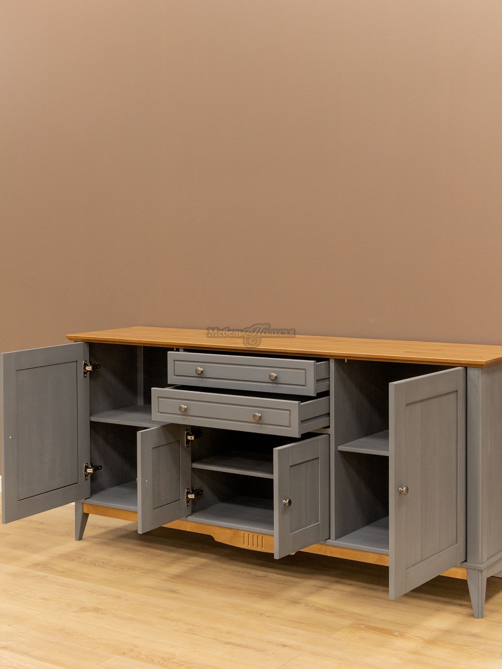 У этой модели комода четыре распашные дверцы и два выдвижных ящика. Донья ящиков изготовлены из прочного белого оргалита, стенки из массива сосны, окрашены в цвет корпуса. Для ящиков предусмотрены шариковые направляющие частичного выдвижения, без доводчиков. Дверцы навешиваются на петлях с доводчиками, закрываются без усилий и бесшумно. Высота от пола до нижнего края планки 12 см, уборку под тумбой можно делать с помощью робота-пылесоса.