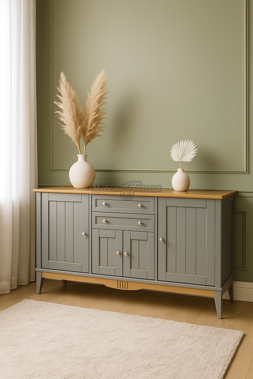 Корпус и фасад комода окрашены в серый цвет, крышка и нижняя декоративная планка – в цвет антик. Эта модель комода также доступна в сочетаниях цветов «белый воск/антик» и «черный/антик». Для окрашивания применяются материалы шведской фирмы Becker Acroma: стойкие, без резких запахов, безопасные для здоровья. Фасады и нижняя планка украшены декоративной фрезеровкой, ручки из металла с искусственным старением.