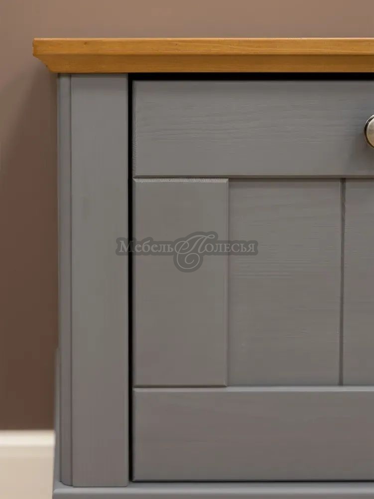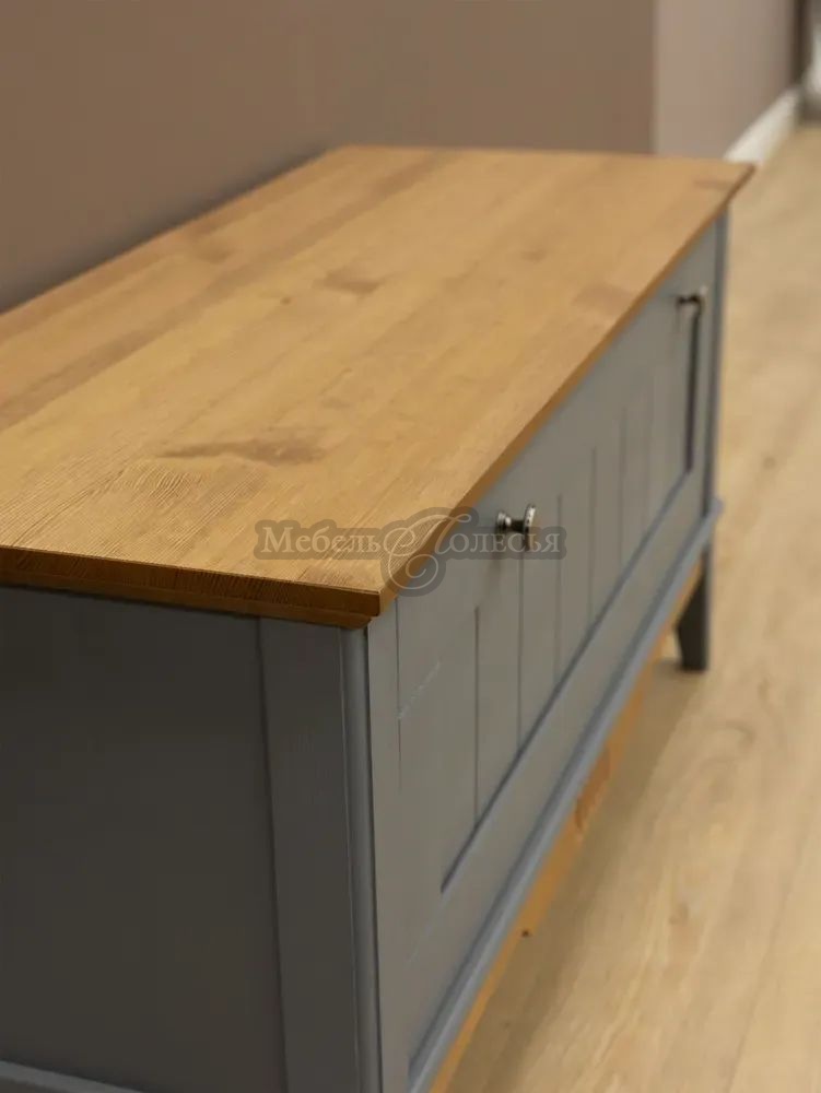 Корпус и фасад окрашены в серый цвет, крышка и нижняя декоративная планка в цвете «антик». Эта же модель обувной тумбы доступна в сочетаниях цветов «белый воск/антик» и «черный/антик». Для отделки применяются качественные, неаллергенные красители шведской марки Becker Acroma.