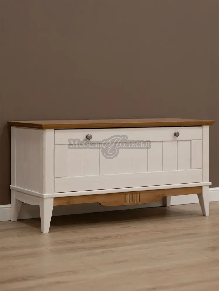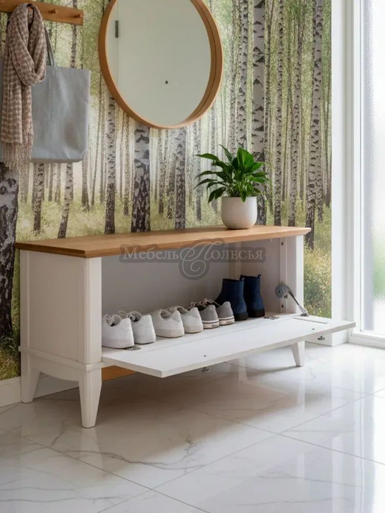 Корпус и фасад окрашены в белый цвет, крышка и нижняя декоративная планка в цвете «антик». Эта же модель обувной тумбы доступна в сочетаниях цветов «серый/антик» и «черный/антик». Для отделки применяются качественные, неаллергенные красители шведской марки Becker Acroma.