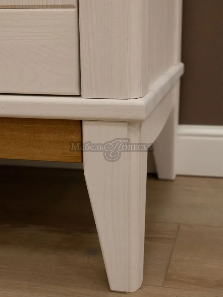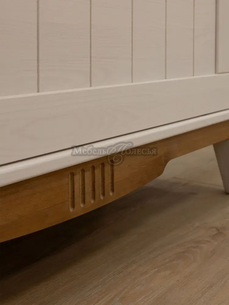 Тумба имеет вместительное отделение с откидной дверцей. Дверца декорирована вертикальной фрезеровкой, нижняя планка также с вертикальными пропилами. В комплекте идут круглые ручки-кнопки с искусственным старением. Высота от пола до нижнего края планки 12 см, под тумбу может заехать робот-пылесос.